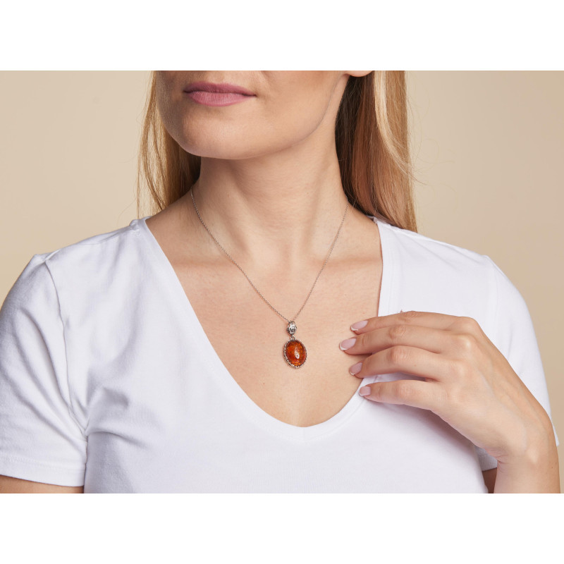 Pendentif ambre cognac/cerise argent rhodié 925/1000. Pendentif livré avec chaîne argent 925/1000.