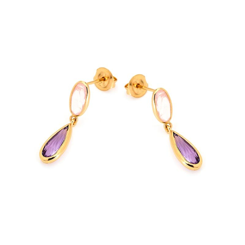 BOUCLES D'OREILLES ARGENT DORE AMETHYSTE ET QUARTZ ROSE