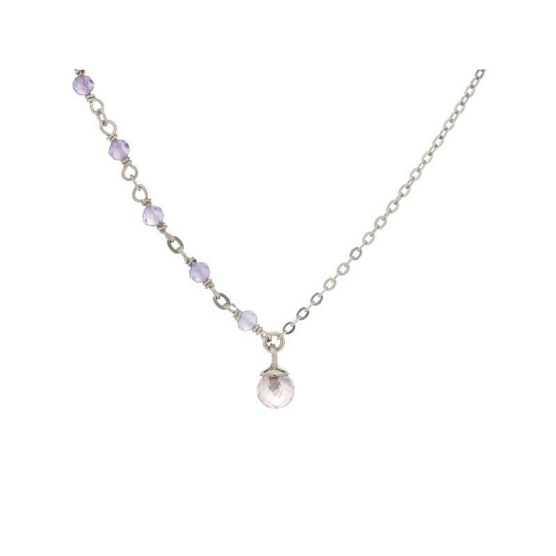 Collier amethyste et quartz rose rond 10mm argent rhodié 925