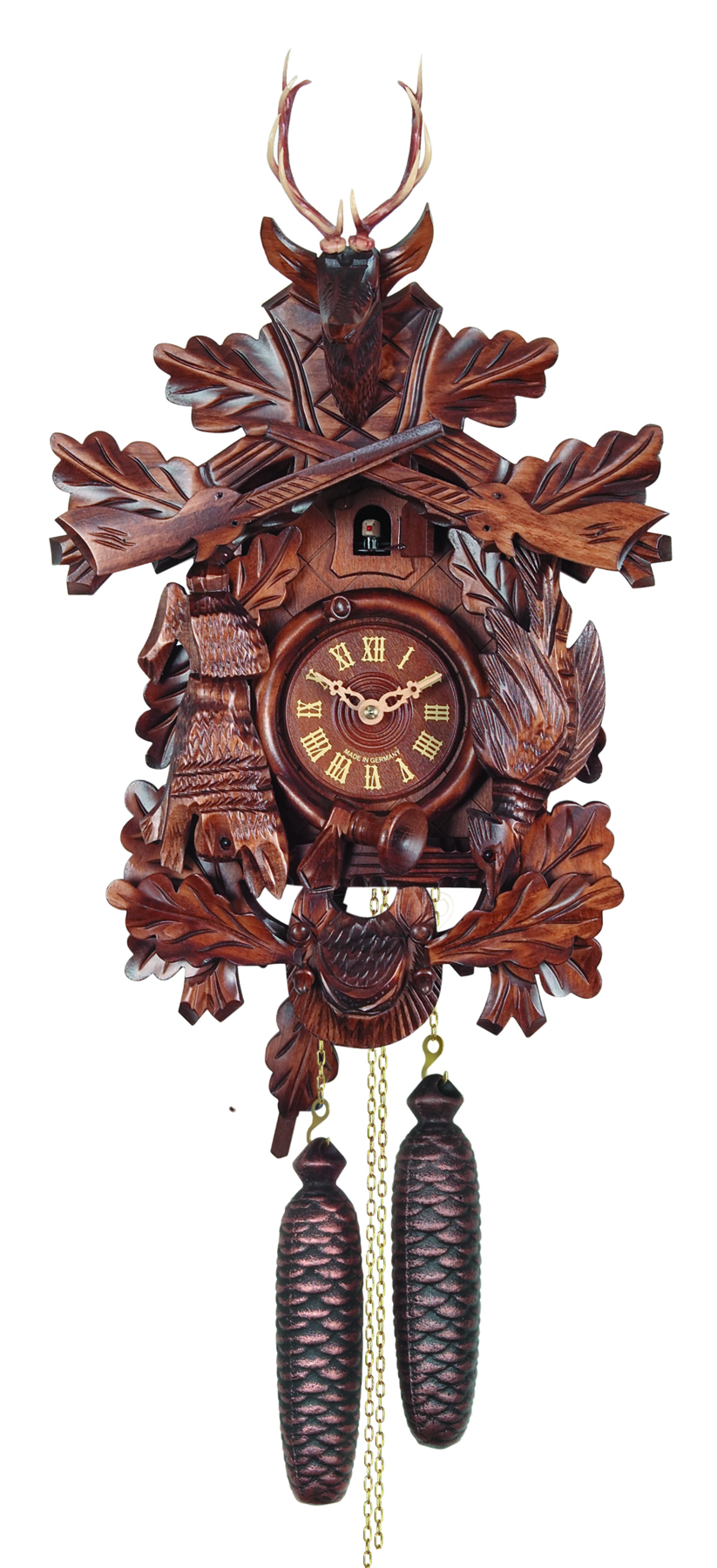 Le poids de droite fait fonctionner le mouvement, celui de gauche anime le coucou avec son chant.