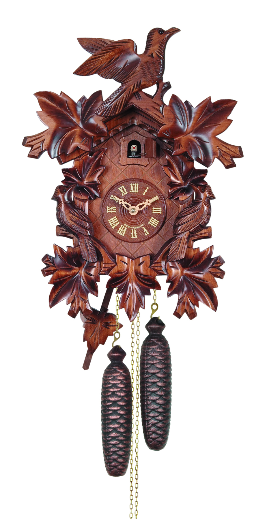 Le poids de droite fait fonctionner le mouvement, celui de gauche anime le coucou avec son chant.