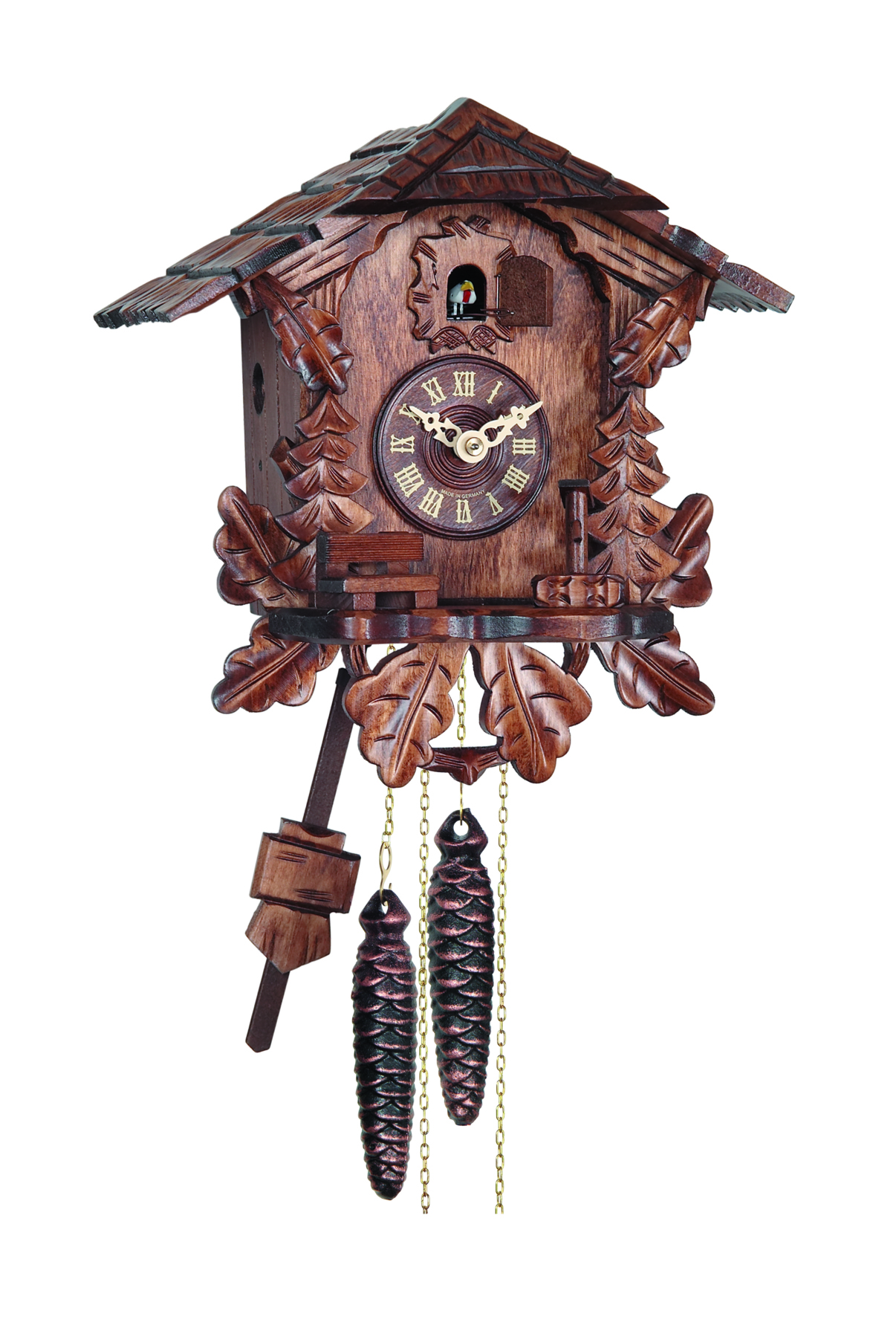 Le poids de droite fait fonctionner le mouvement, celui de gauche anime le coucou avec son chant.