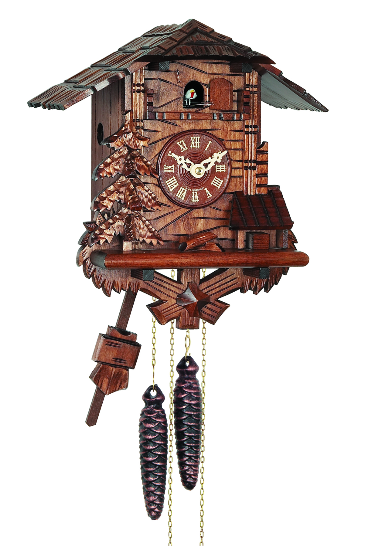 Le poids de droite fait fonctionner le mouvement, celui de gauche anime le coucou avec son chant.