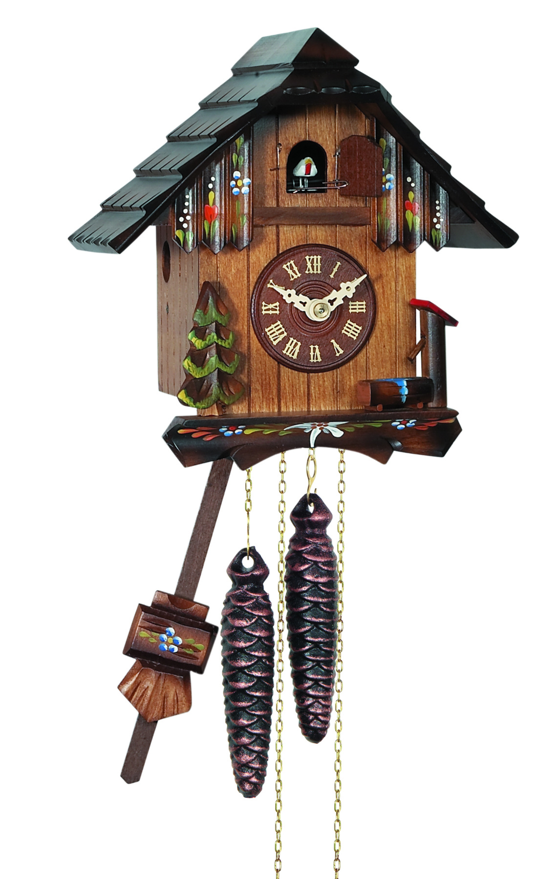 Le poids de droite fait fonctionner le mouvement, celui de gauche anime le coucou avec son chant.