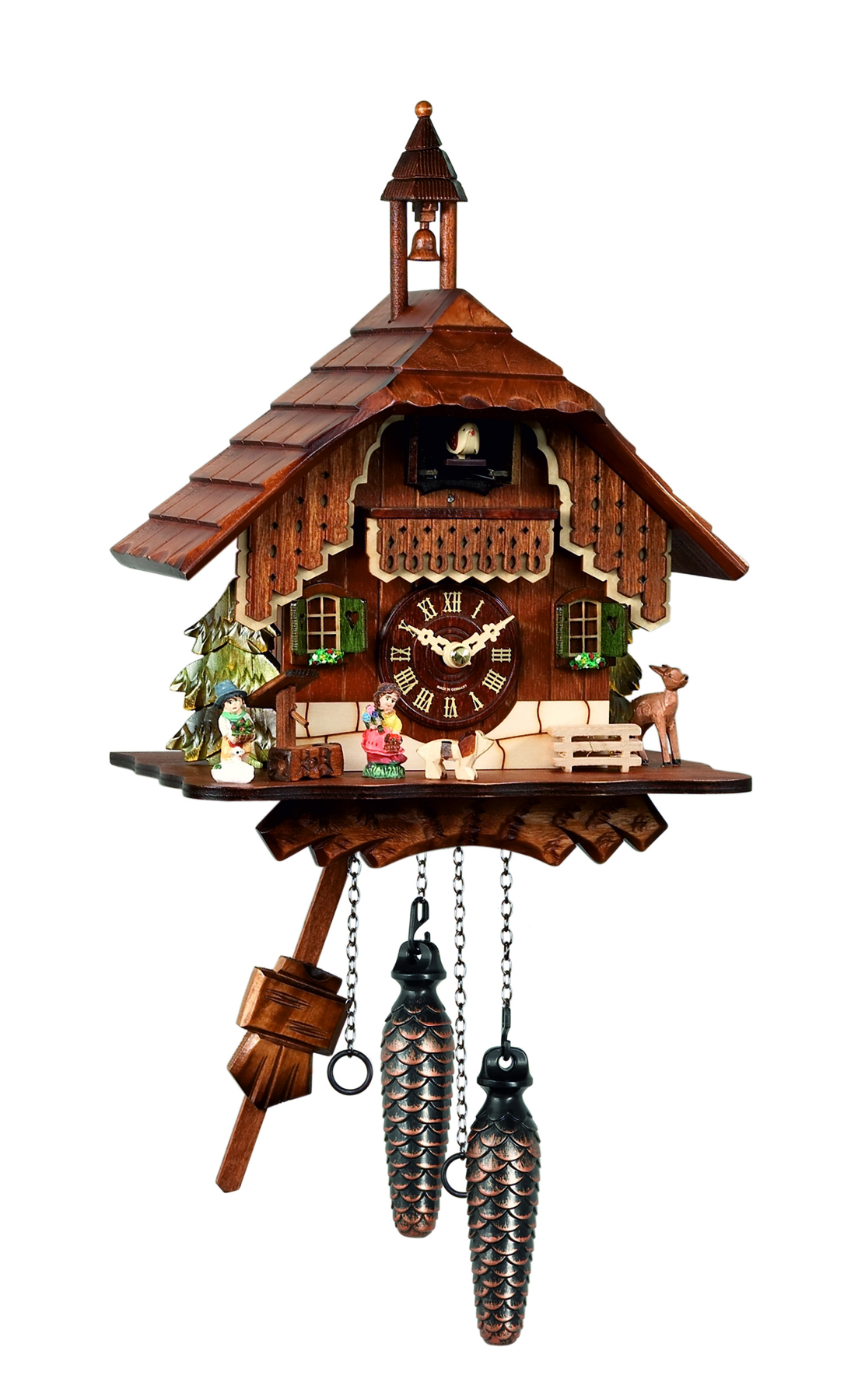Le poids de droite fait fonctionner le mouvement, celui de gauche anime le coucou avec son chant.