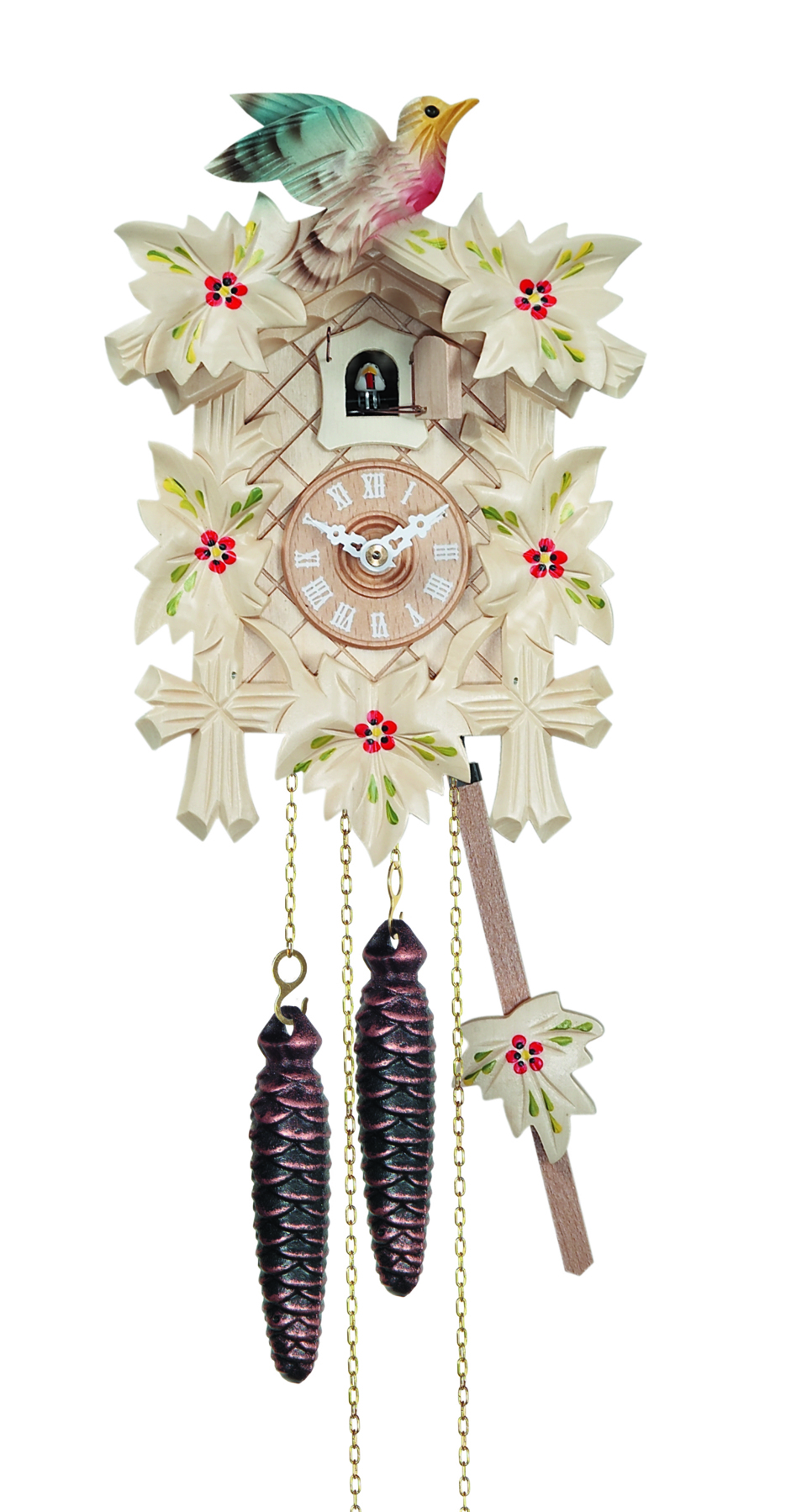 Le poids de droite fait fonctionner le mouvement, celui de gauche anime le coucou avec son chant.