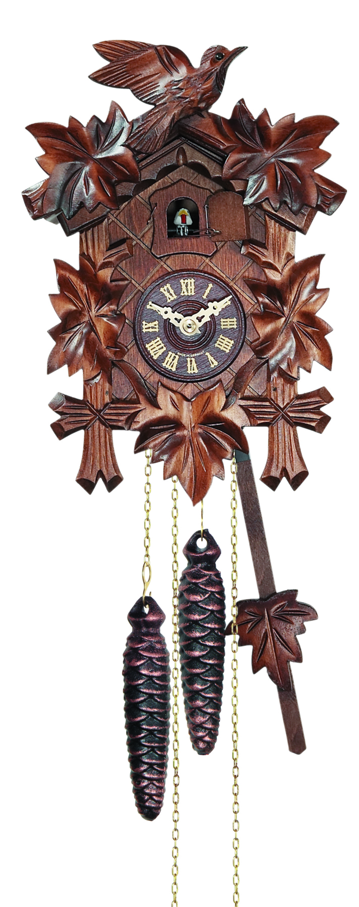Le poids de droite fait fonctionner le mouvement, celui de gauche anime le coucou avec son chant.