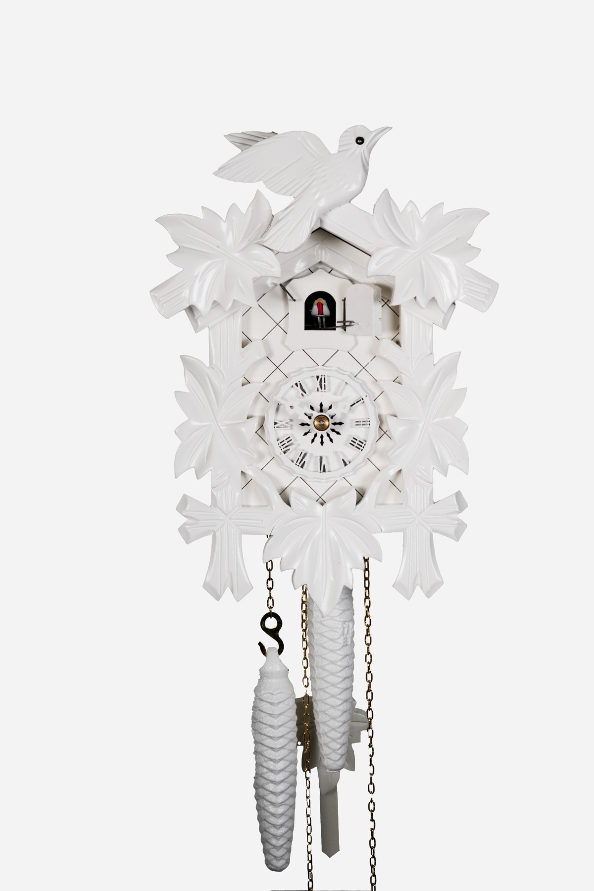 Le poids de droite fait fonctionner le mouvement, celui de gauche anime le coucou avec son chant.