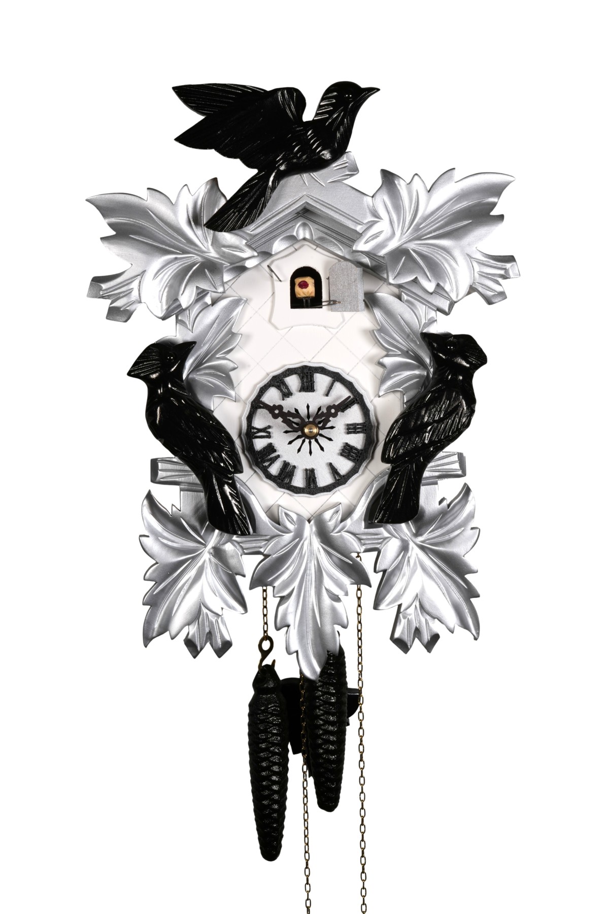 Le poids de droite fait fonctionner le mouvement, celui de gauche anime le coucou avec son chant.