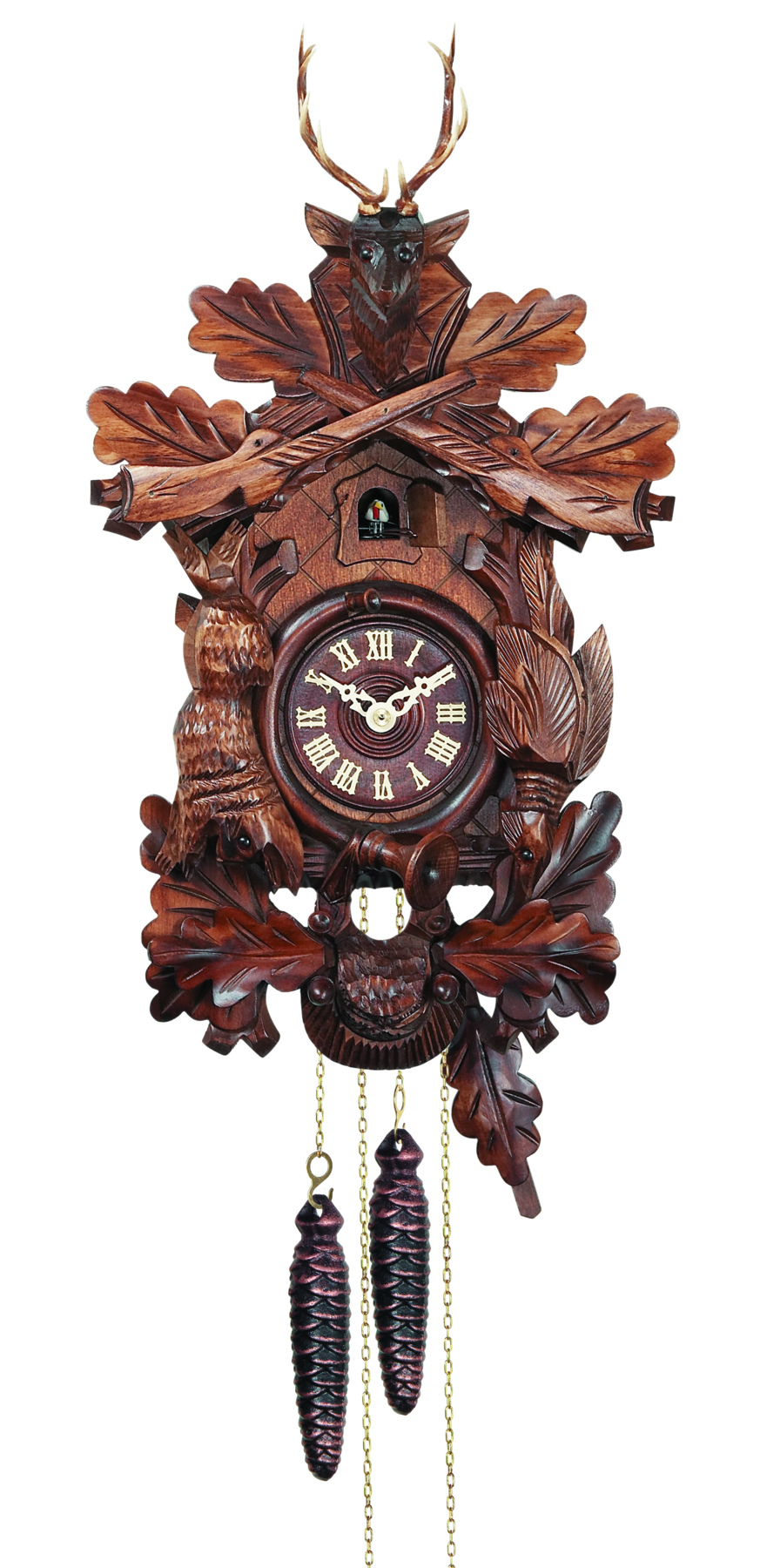 Le poids de droite fait fonctionner le mouvement, celui de gauche anime le coucou avec son chant.