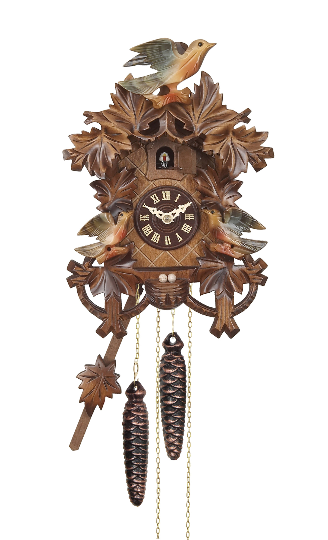 Le poids de droite fait fonctionner le mouvement, celui de gauche anime le coucou avec son chant