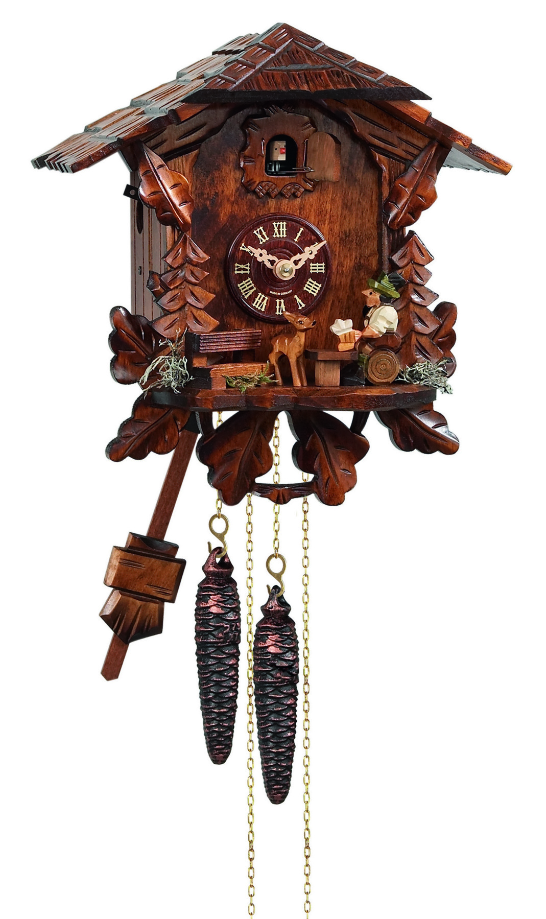 Le poids de droite fait fonctionner le mouvement, celui de gauche anime le coucou avec son chant et actionne le mouvement du buveur de bière qui lève sa chope.