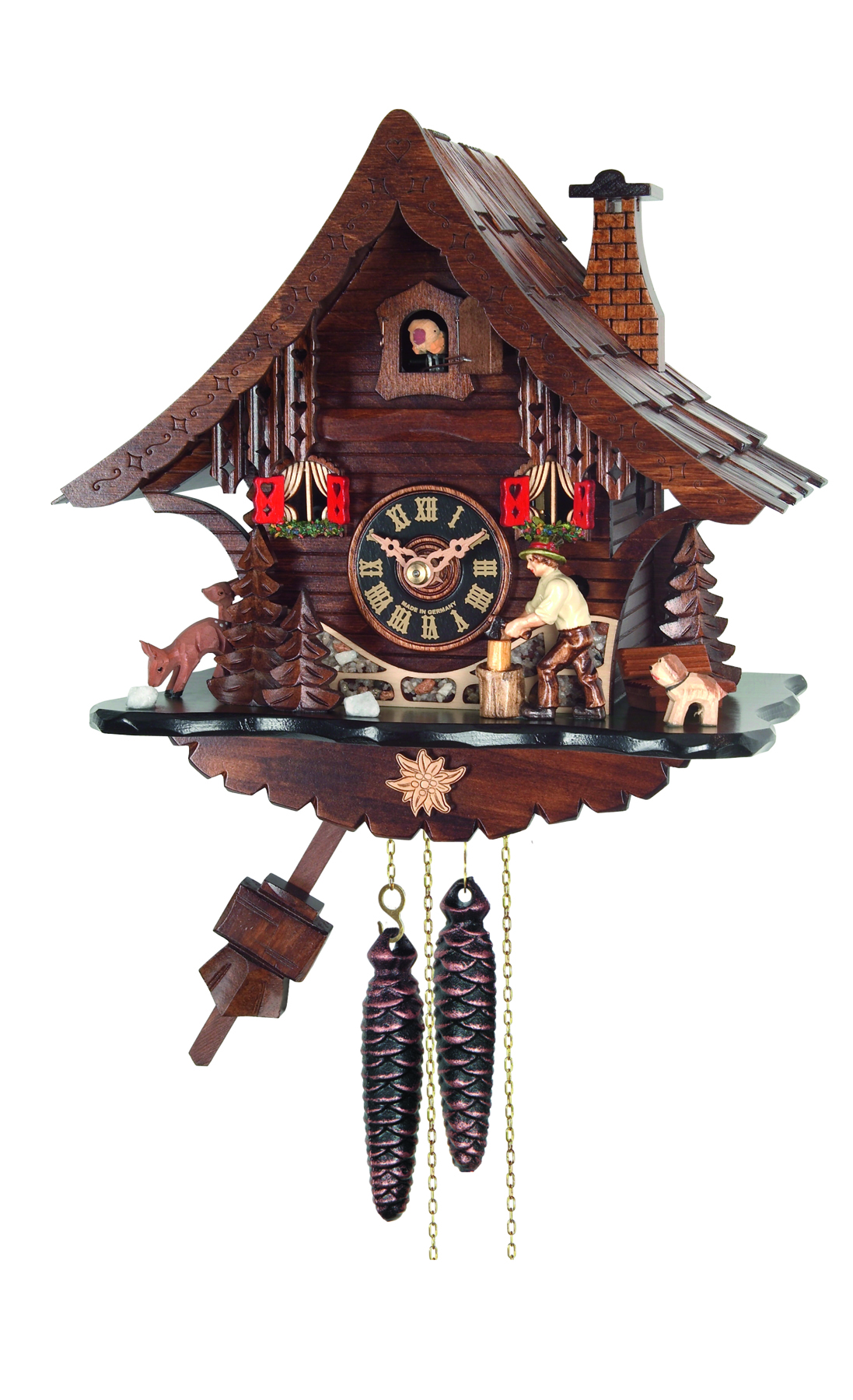 Le poids de droite fait fonctionner le mouvement, celui de gauche anime le coucou avec son chant et actionne le mouvement du bûcheron qui lève sa hâche.