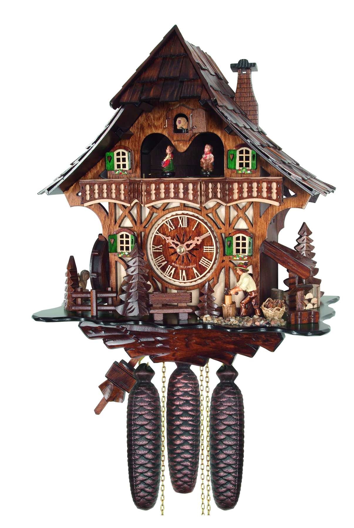 Le bûcheron coupe la bûche, la roue à aube tourne et le manège des personnages s'active...