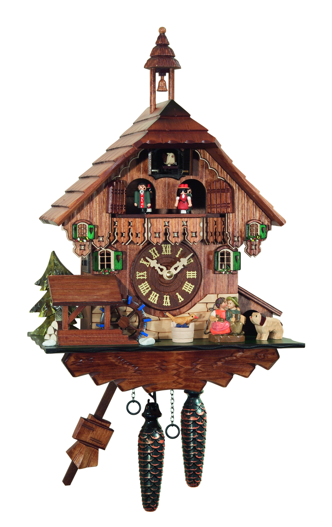 Le poids de gauche fait fonctionner le mouvement, celui de droite anime le coucou avec son chant, la roue à aube du chalet, et le manège de personnage
