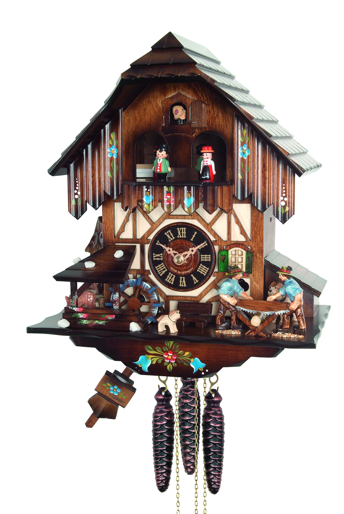 Le poids de gauche fait fonctionner le mouvement, celui de droite anime le coucou avec son chant, et le central les deux bûcherons, la roue à aube du chalet, et le manège de personnage