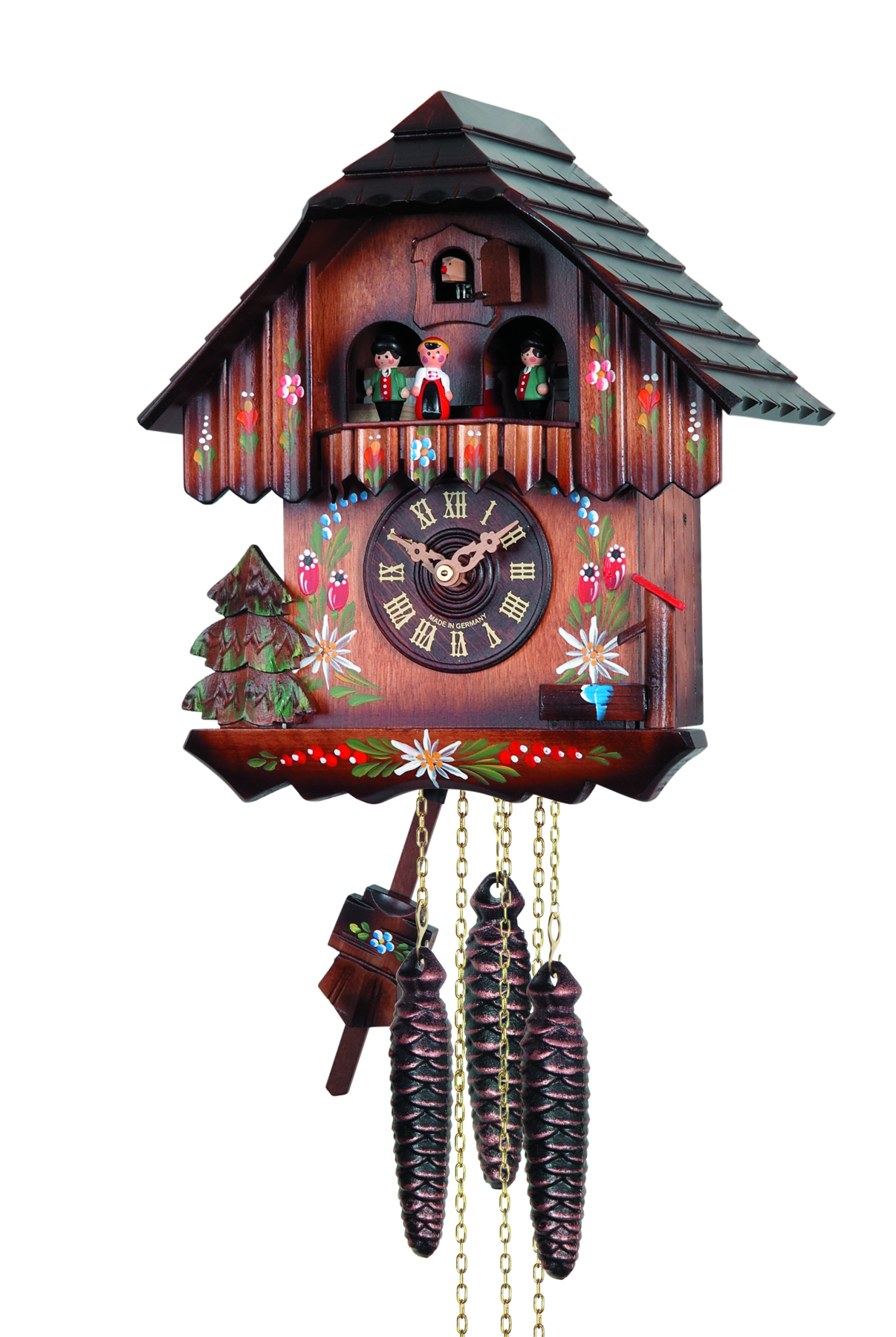 Le poids de gauche fait fonctionner le mouvement, celui de droite anime le coucou avec son chant, et le central déclenche le manège de personnages