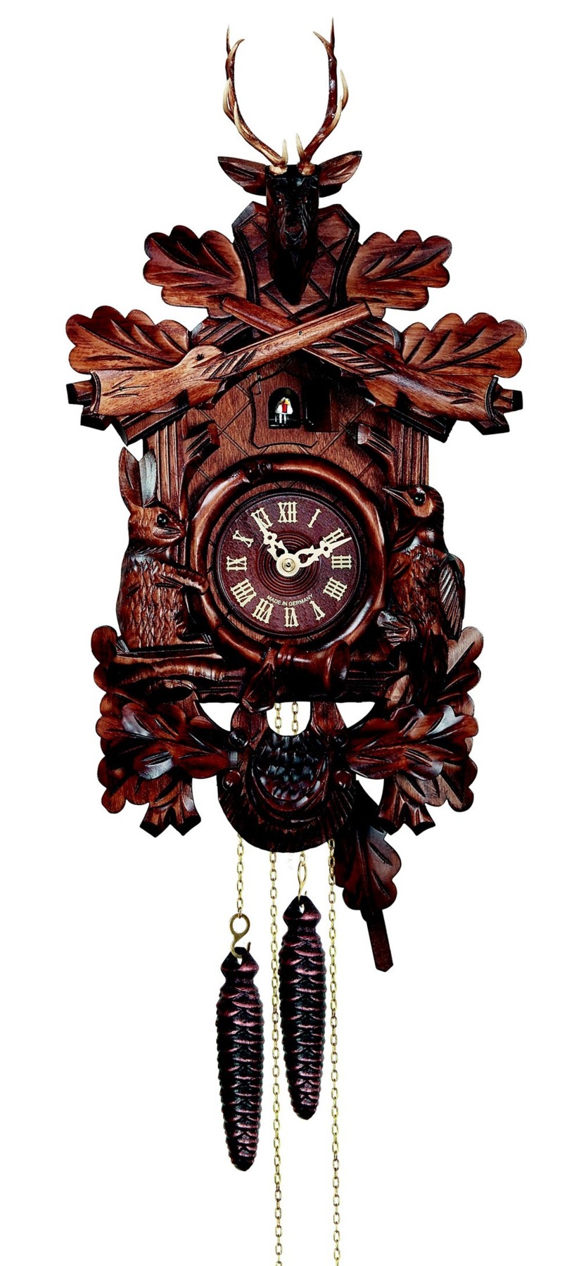 Le poids de droite fait fonctionner le mouvement, celui de gauche anime le coucou avec son chant