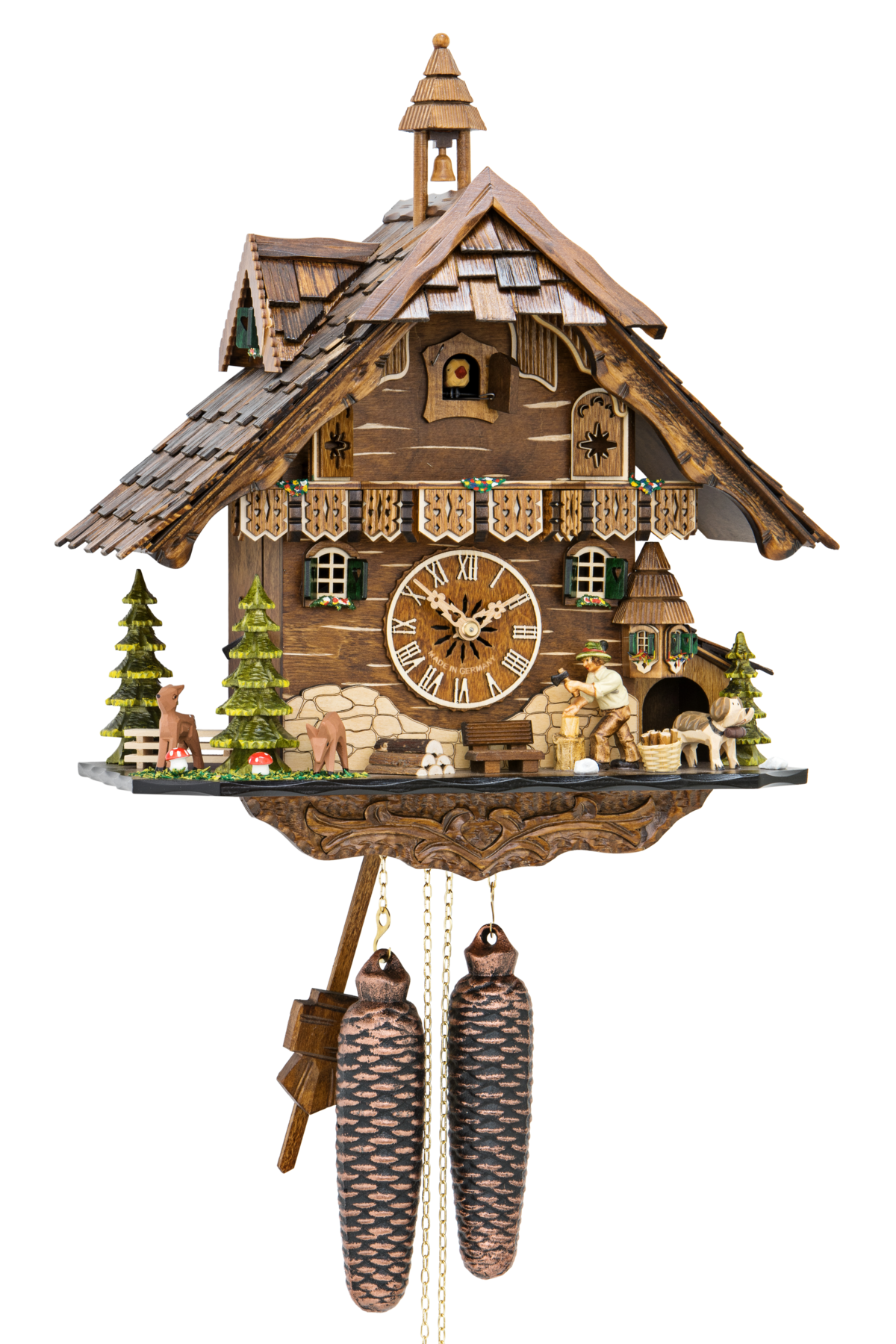 Le poids de droite fait fonctionner le mouvement, celui de gauche anime le coucou avec son chant, l'enfant bouge sur son cheval de bois actionne sa hâche pour couper le bois