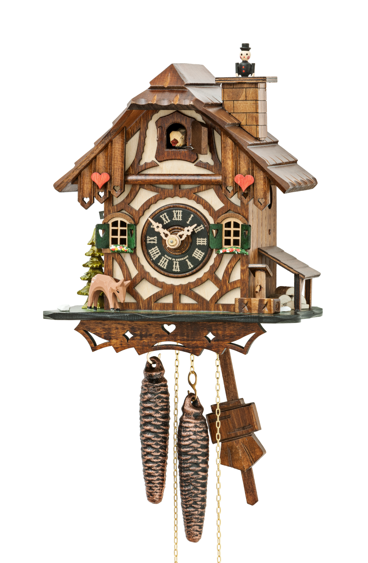Le poids de droite fait fonctionner le mouvement, celui de gauche anime le coucou avec son chant
