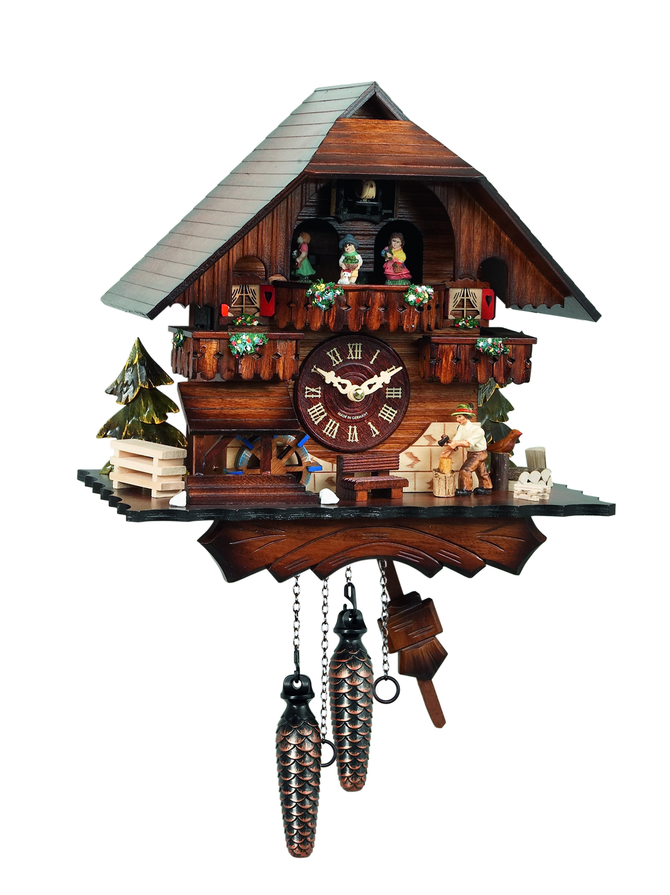 Le chalet et les personnages sont en bois, le décor peint à la main