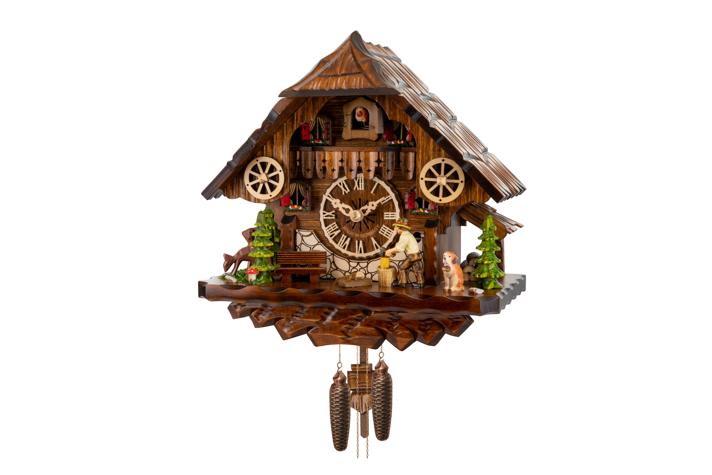 Le poids de droite fait fonctionner le mouvement, celui de gauche anime le coucou avec son chant