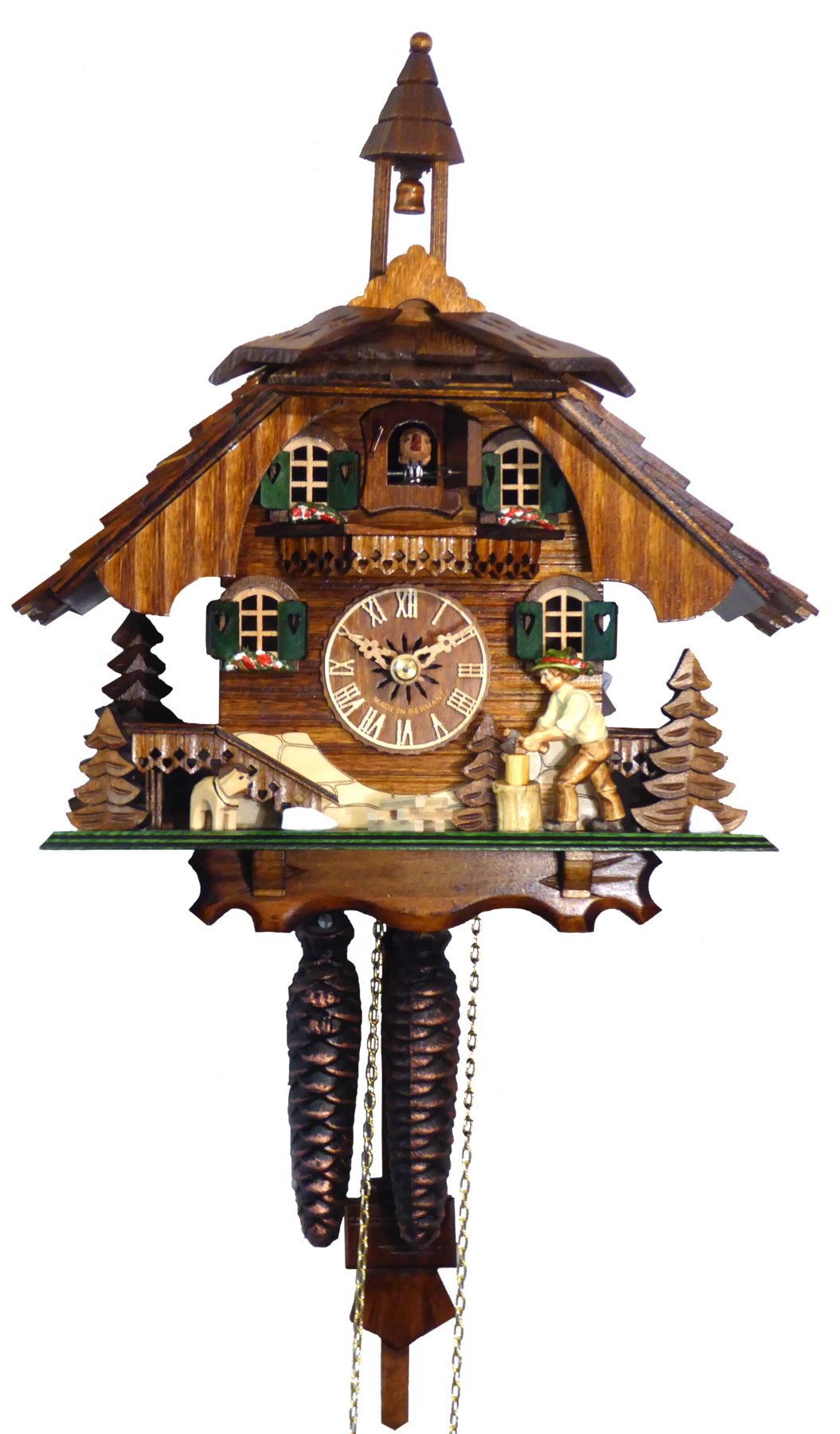 Le poids de droite fait fonctionner le mouvement, celui de gauche anime le coucou avec son chant