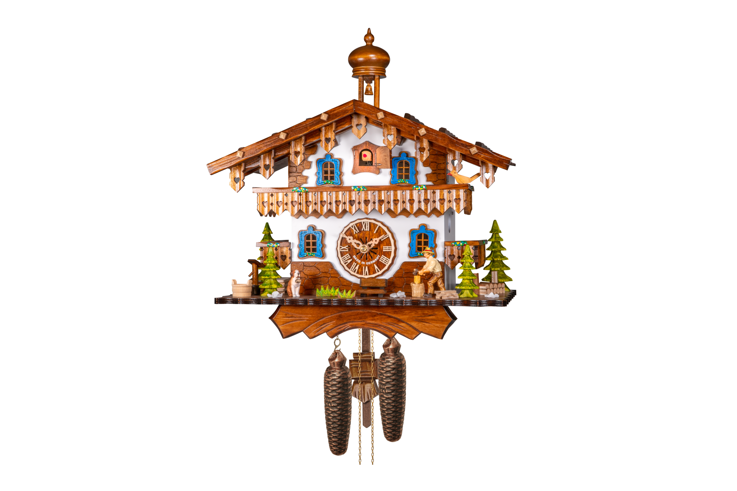 Le poids de droite fait fonctionner le mouvement, celui de gauche anime le coucou avec son chant, le bûcheron actionne sa hâche pour couper le bois