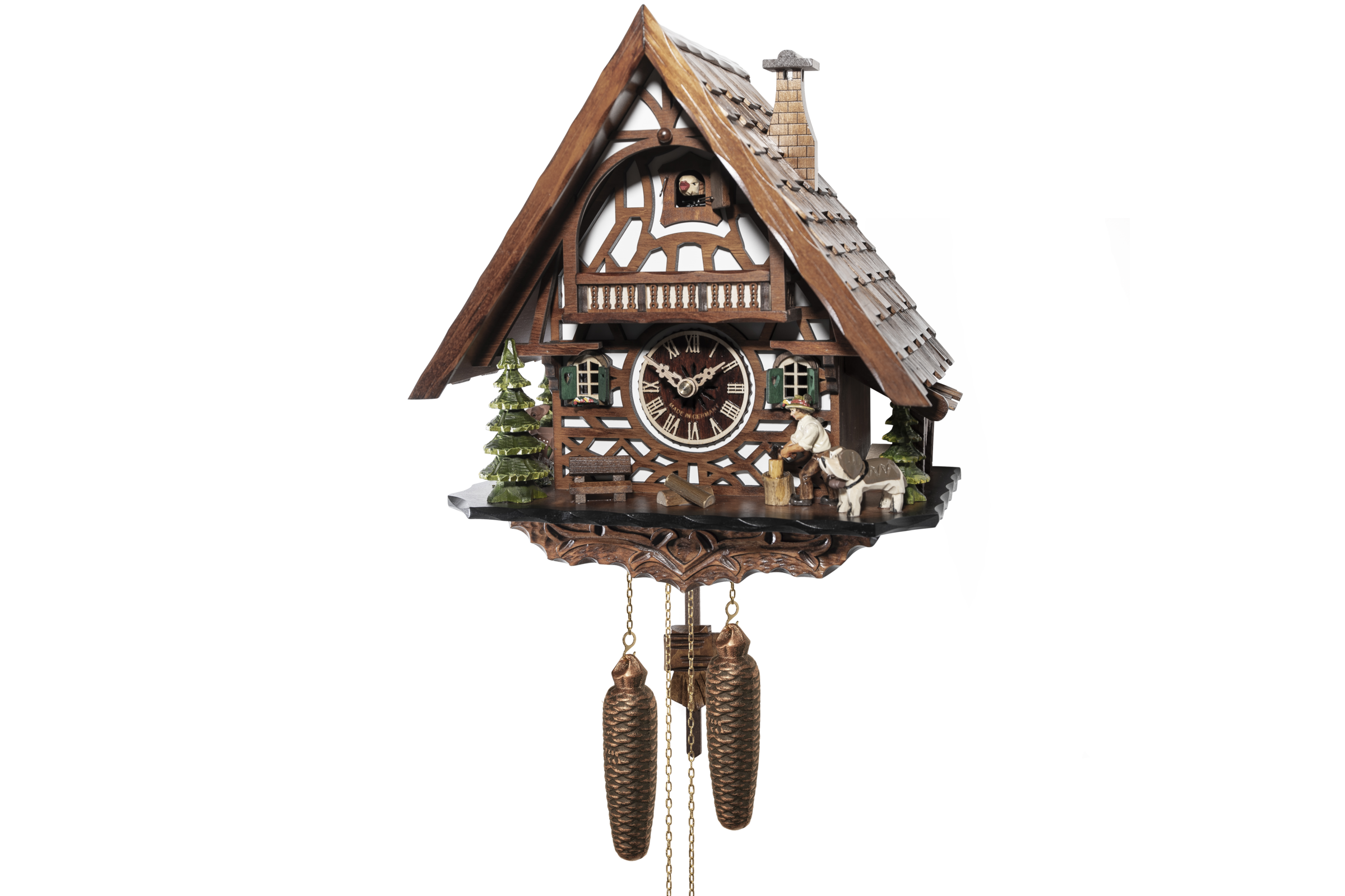 Le poids de droite fait fonctionner le mouvement, celui de gauche anime le coucou avec son chant, et le bûcheron qui hache du bois