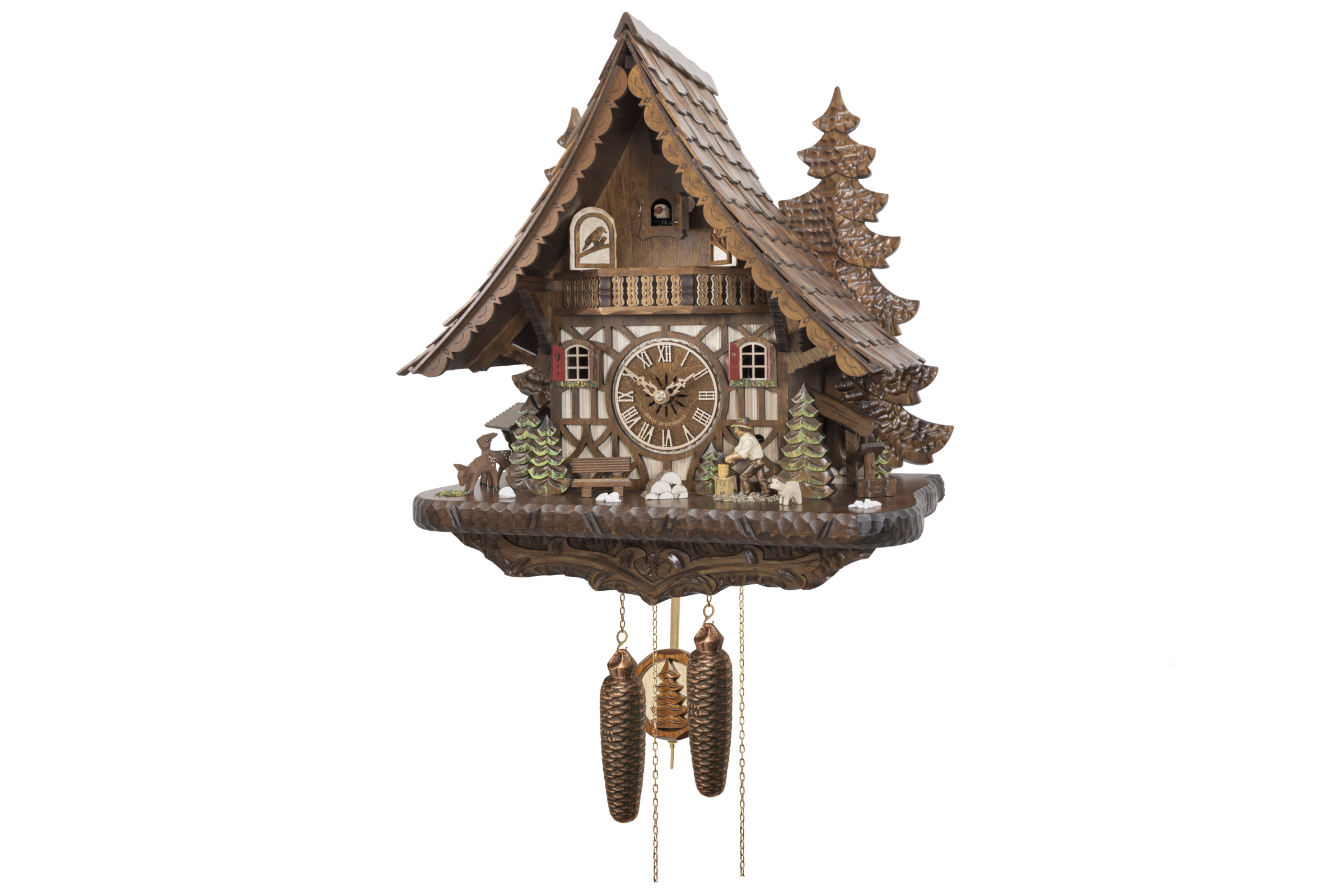 Le poids de droite fait fonctionner le mouvement, celui de gauche anime le coucou avec son chant, et le bûcheron qui hache du bois