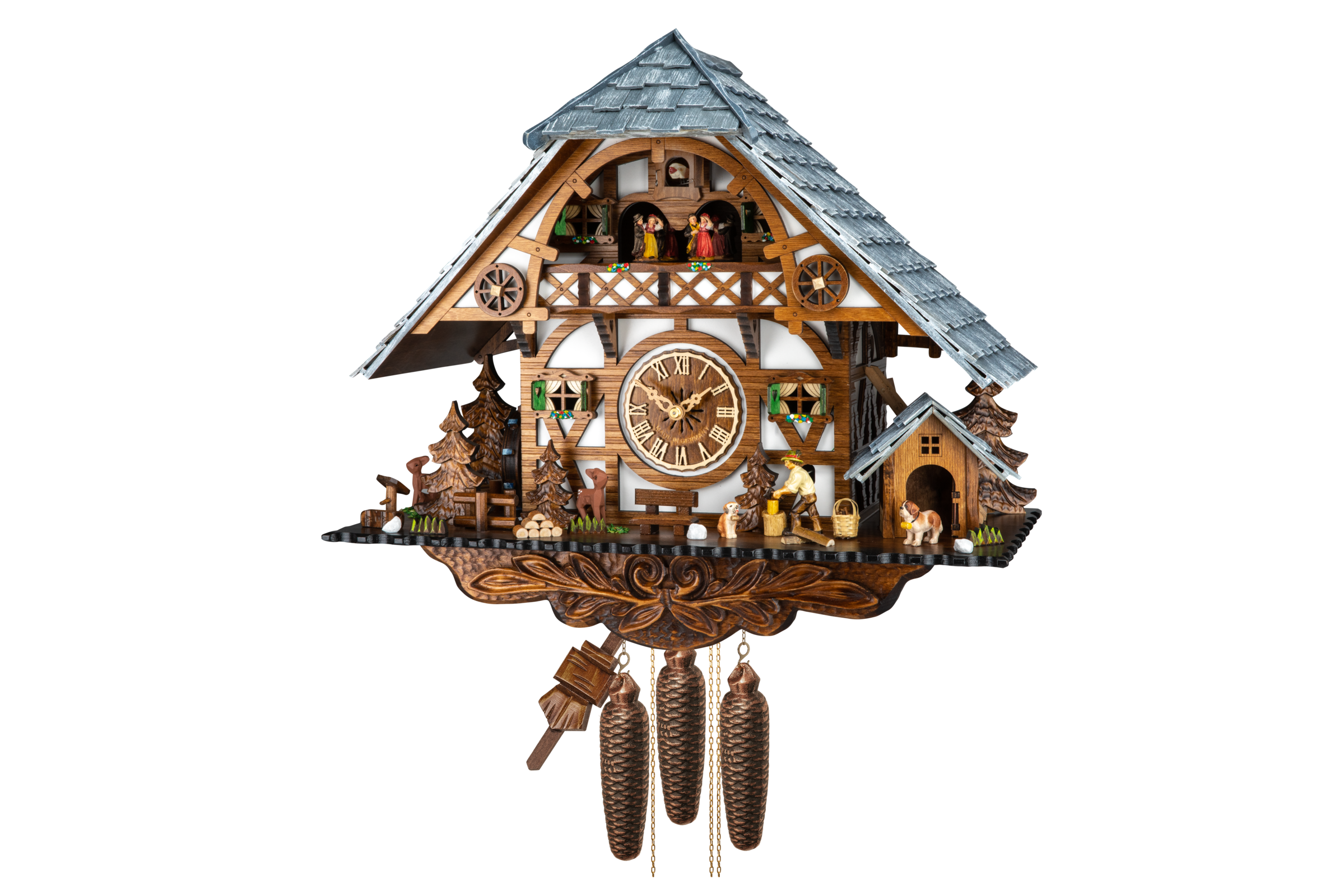 La danse des personnages s'active en musique, ainsi que la roue à aube qui tourne, et le bûcheron qui coupe du bois