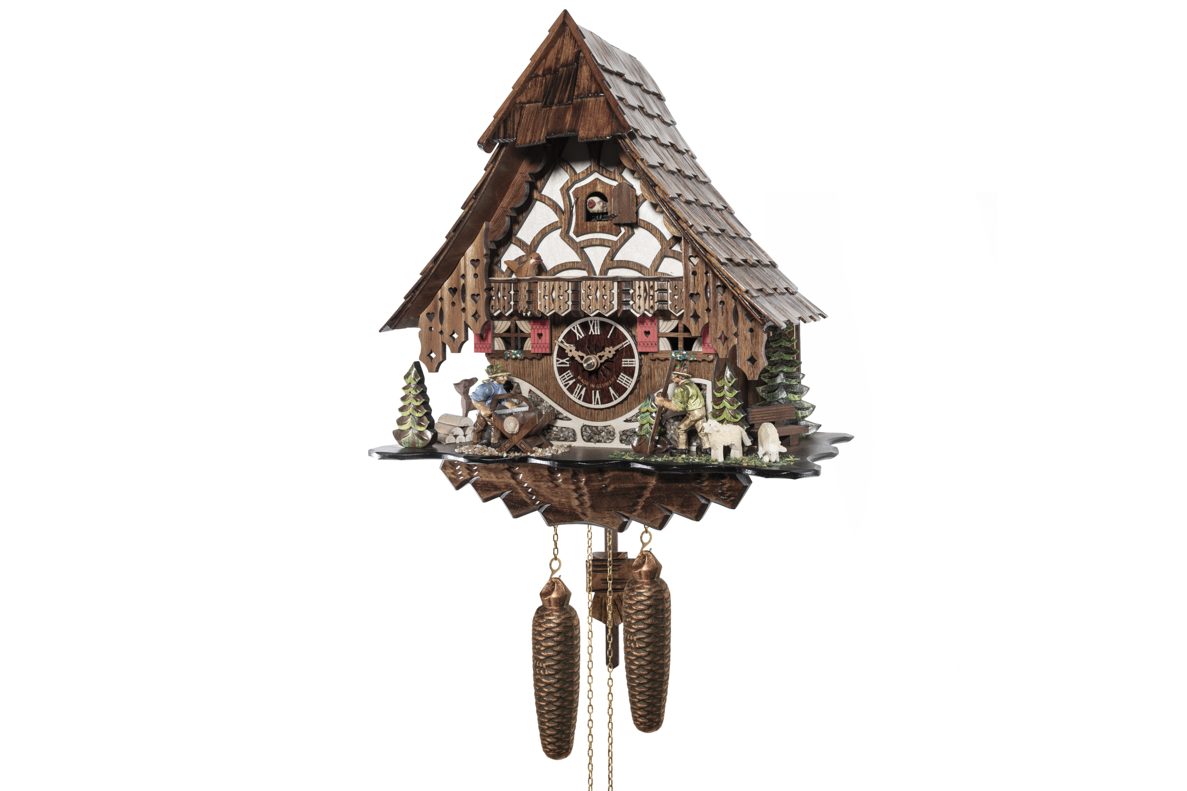 Le poids de droite fait fonctionner le mouvement, celui de gauche anime le coucou avec son chant, et le bûcheron qui hache du bois
