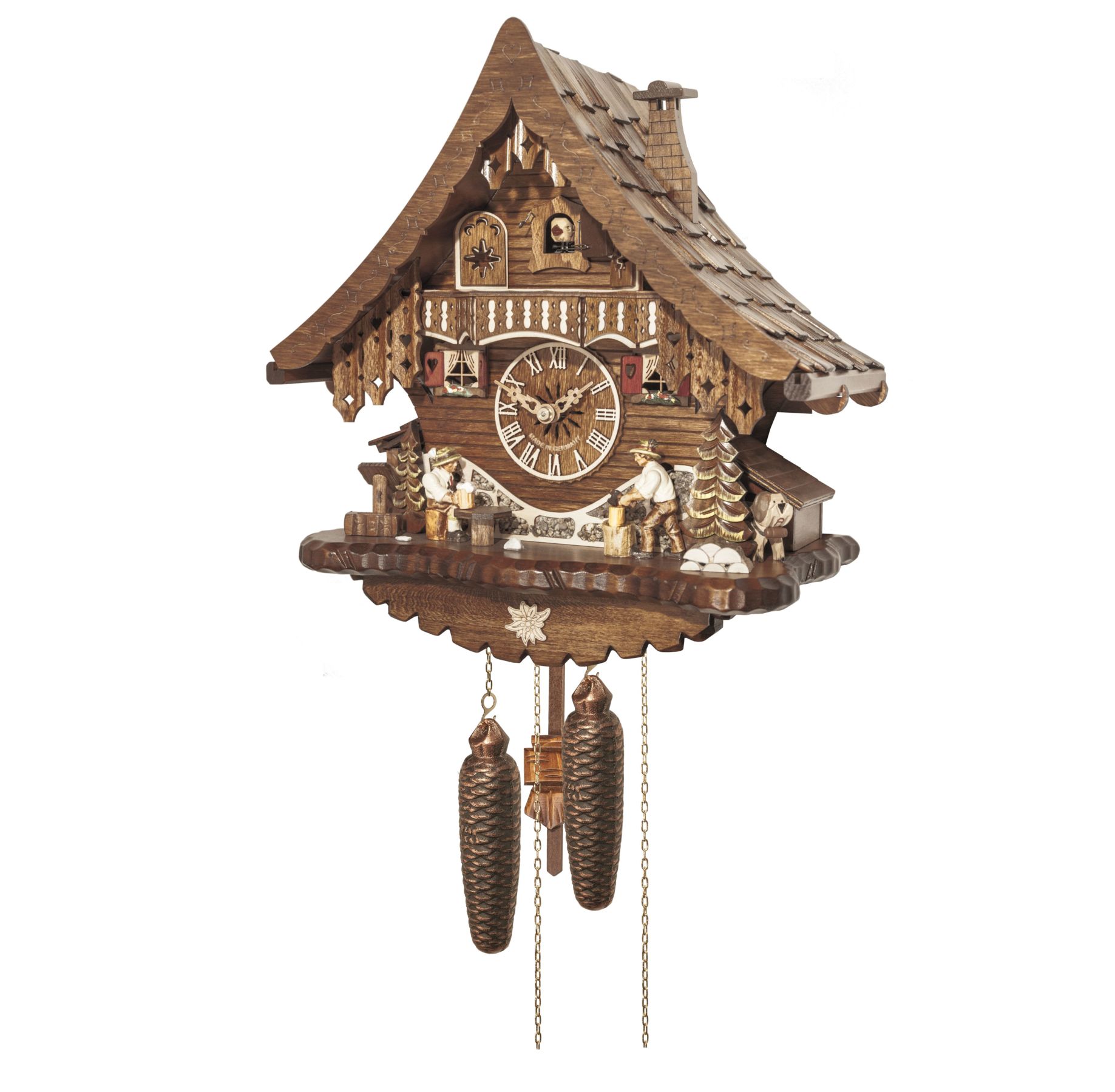 Le poids de droite fait fonctionner le mouvement, celui de gauche anime le coucou avec son chant, et celui du milieu active le bûcheron qui hâche du bois et le berger qui lève sa chope de bière