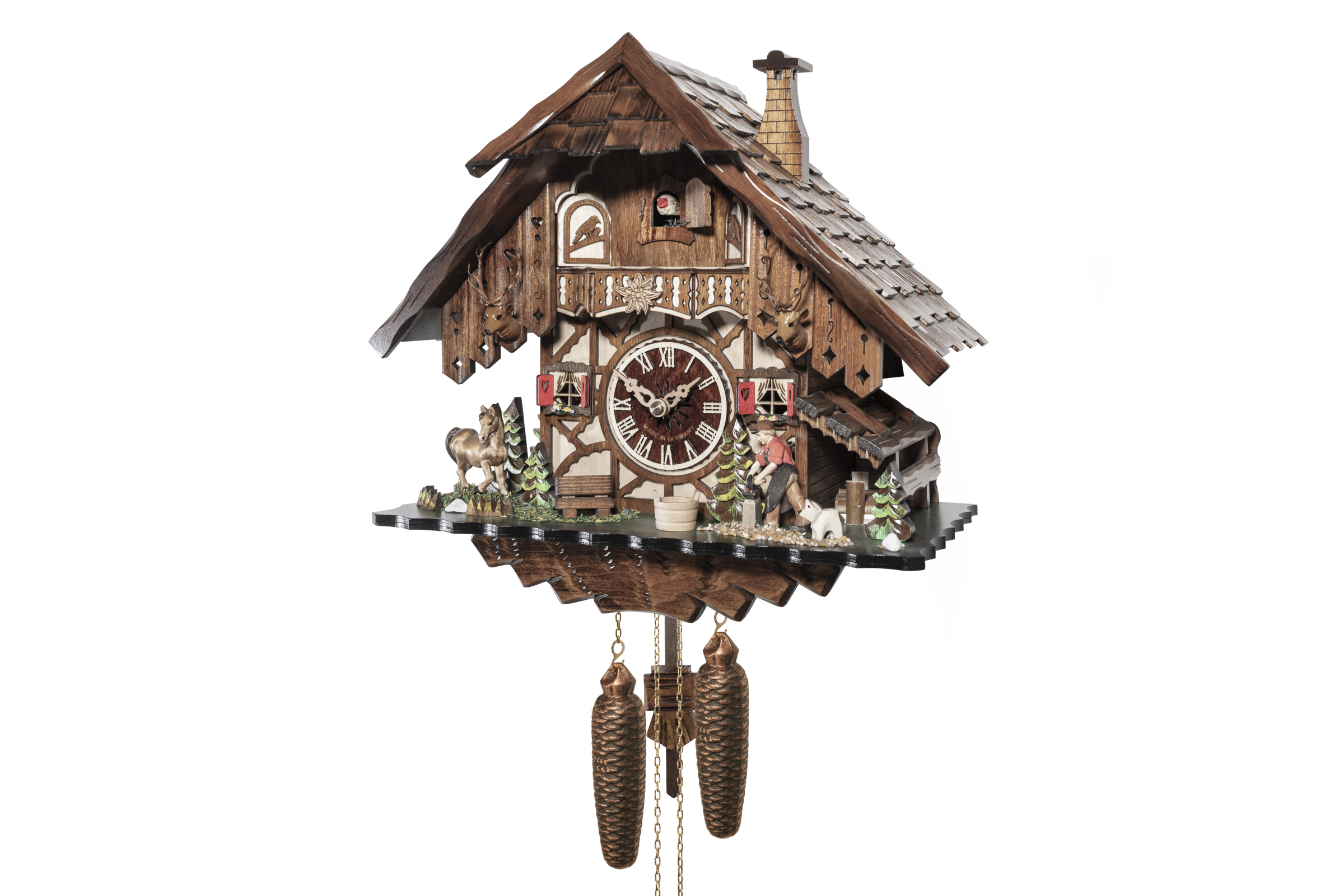 Le poids de droite fait fonctionner le mouvement, celui de gauche anime le coucou avec son chant, et le forgeron