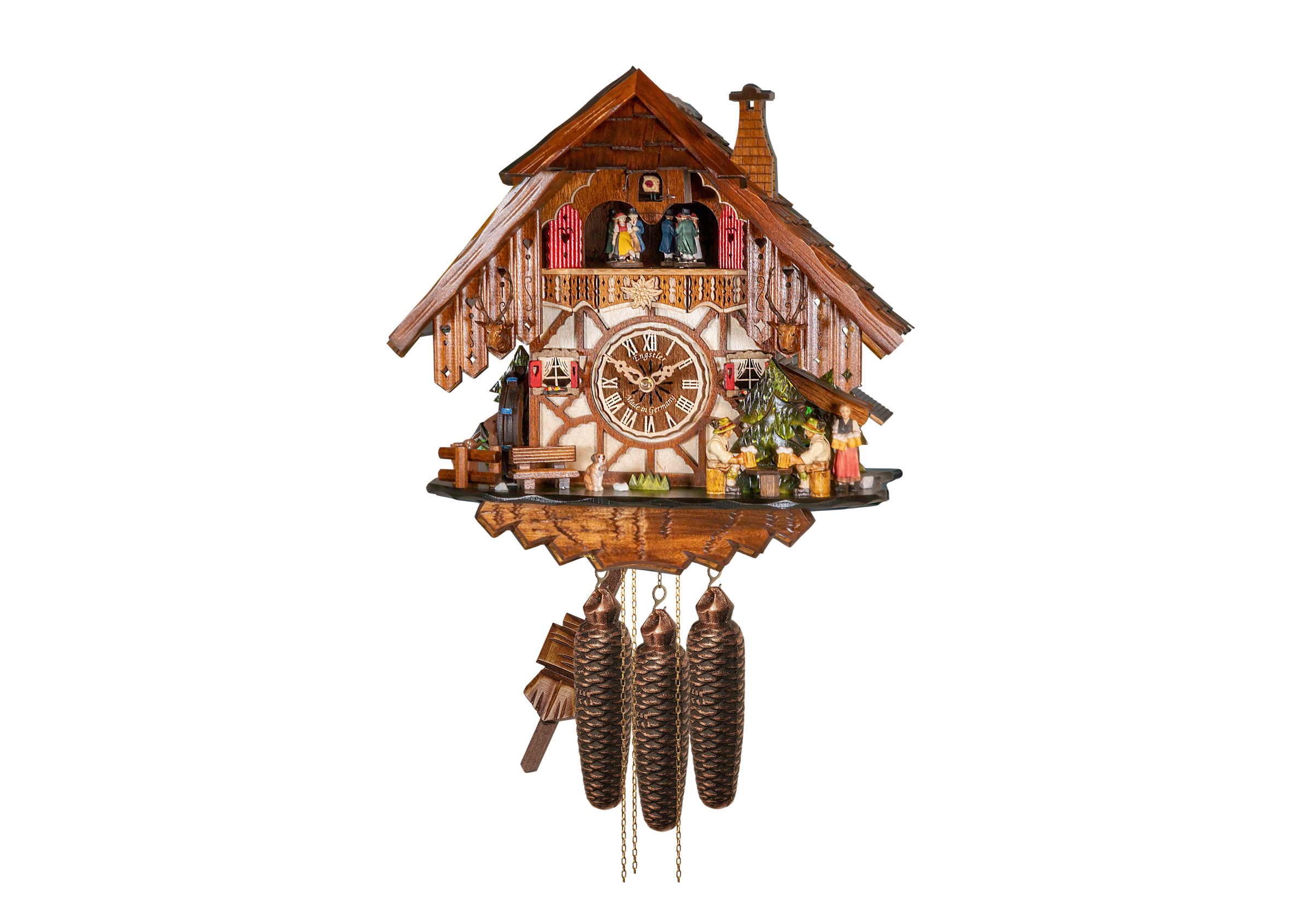 Le poids de droite fait fonctionner le mouvement, celui de gauche anime le coucou avec son chant, les buveurs de bières lèvent leurs chopes, le poids du milieu actionne la roue à aube et la danse des personnages en musique