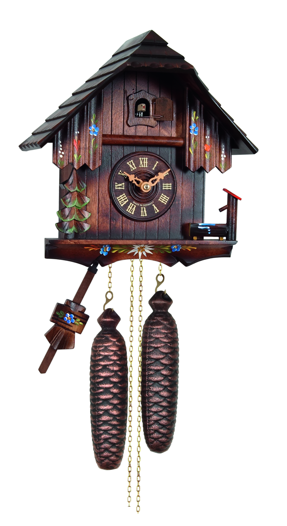 Le poids de droite fait fonctionner le mouvement, celui de gauche anime le coucou avec son chant