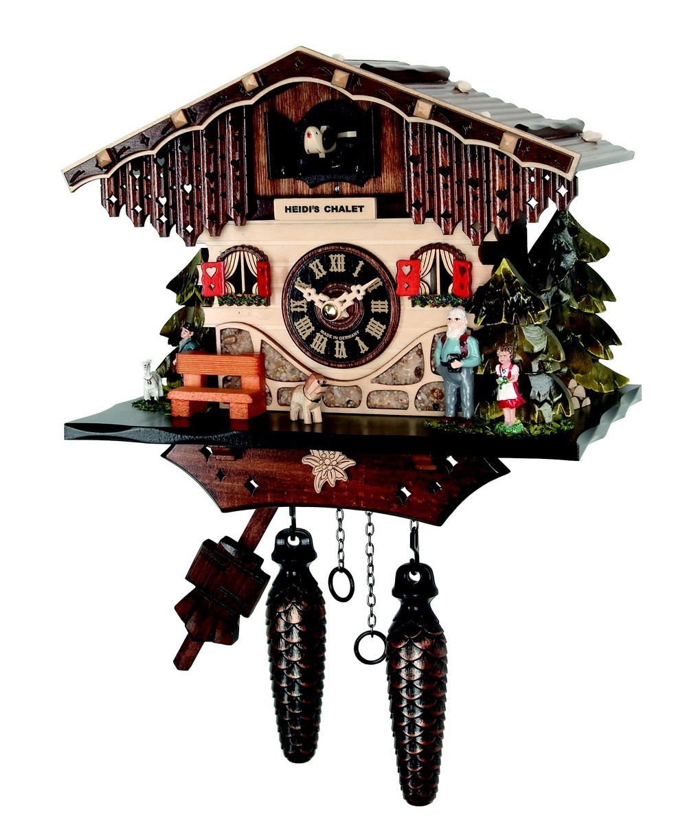 Le coucou et les personnages sont en bois, les décors peints à la main