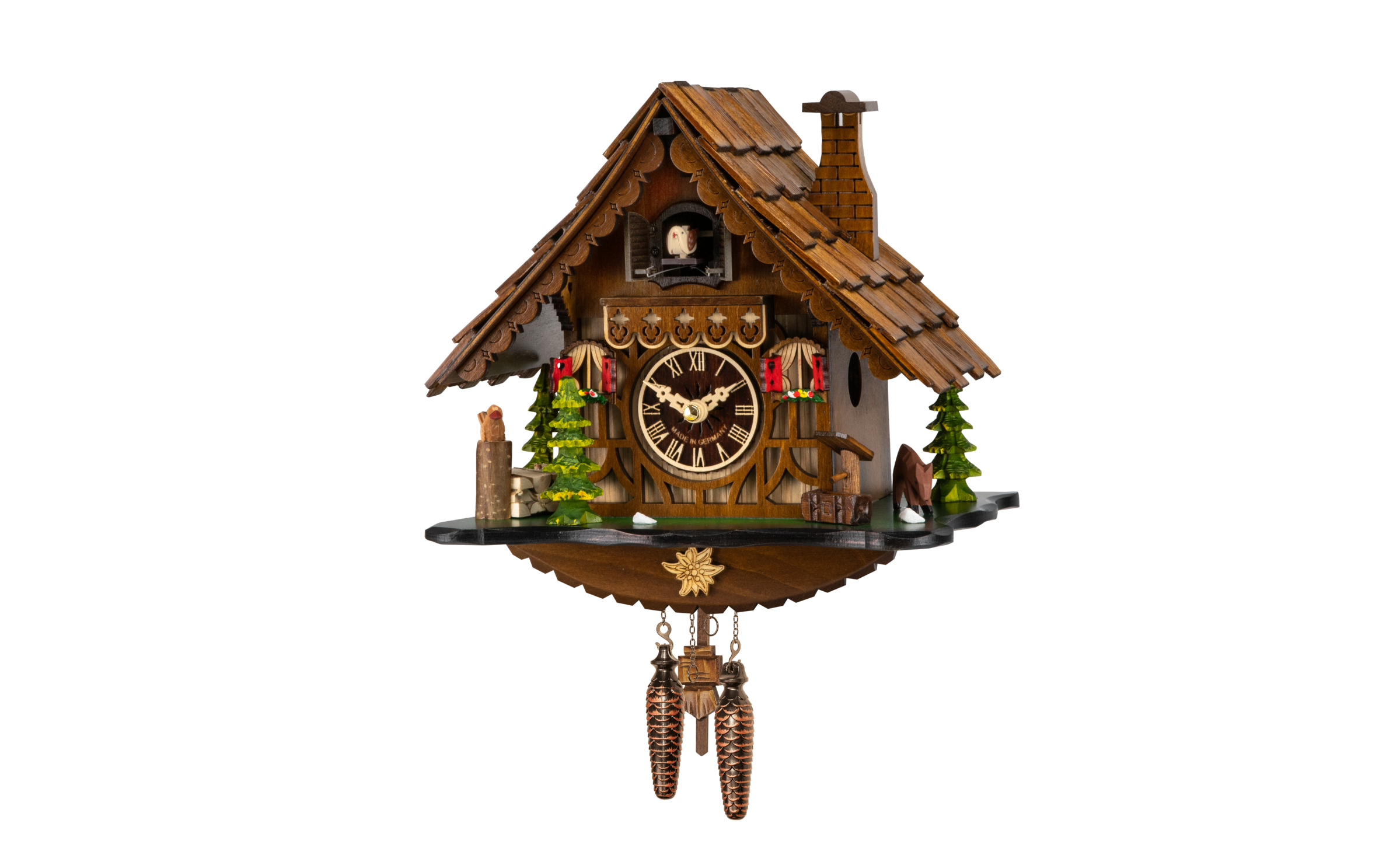 Le coucou et les personnages sont en bois, les décors peints à la main