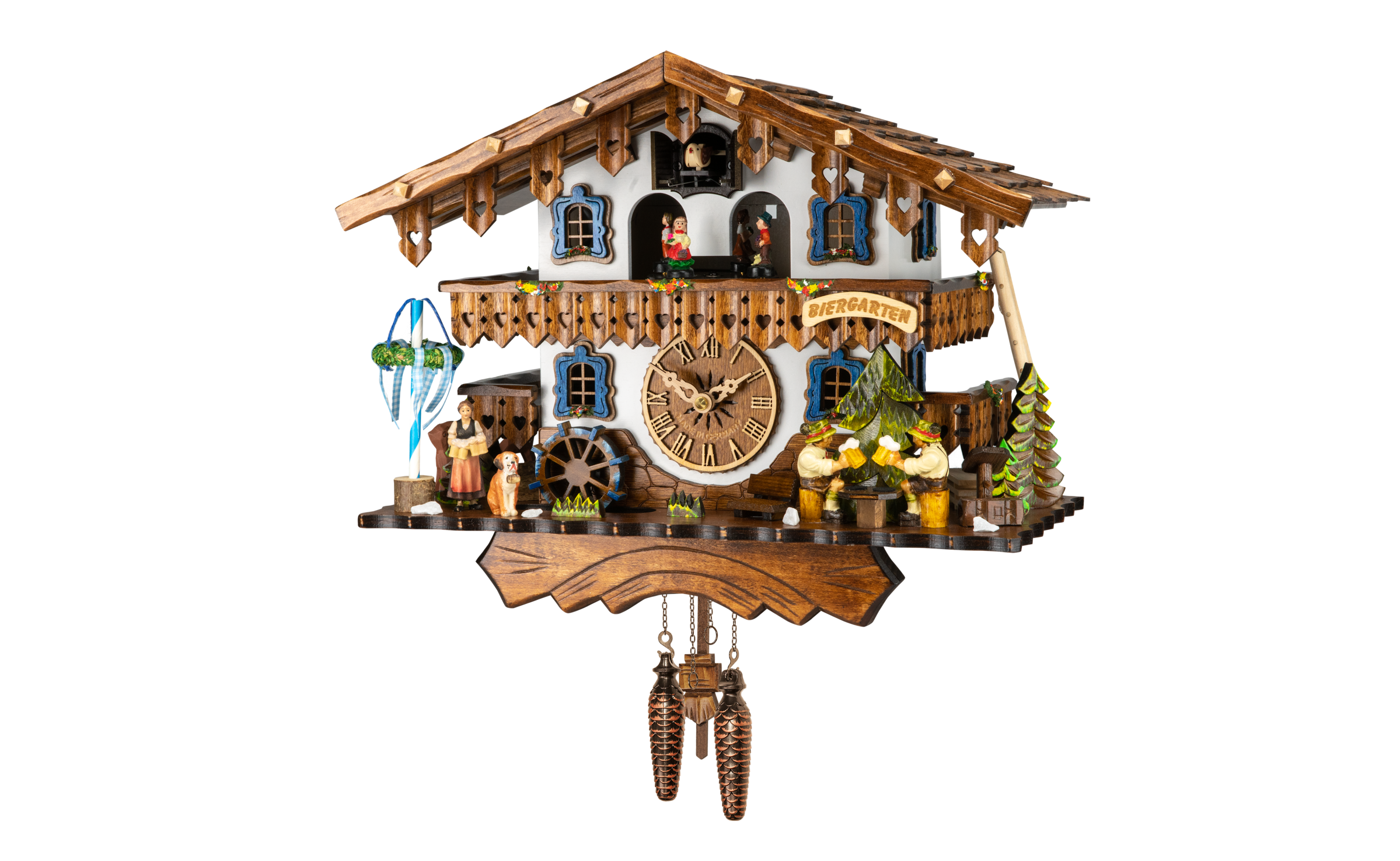 Le coucou et les personnages sont en bois, les décors peints à la main