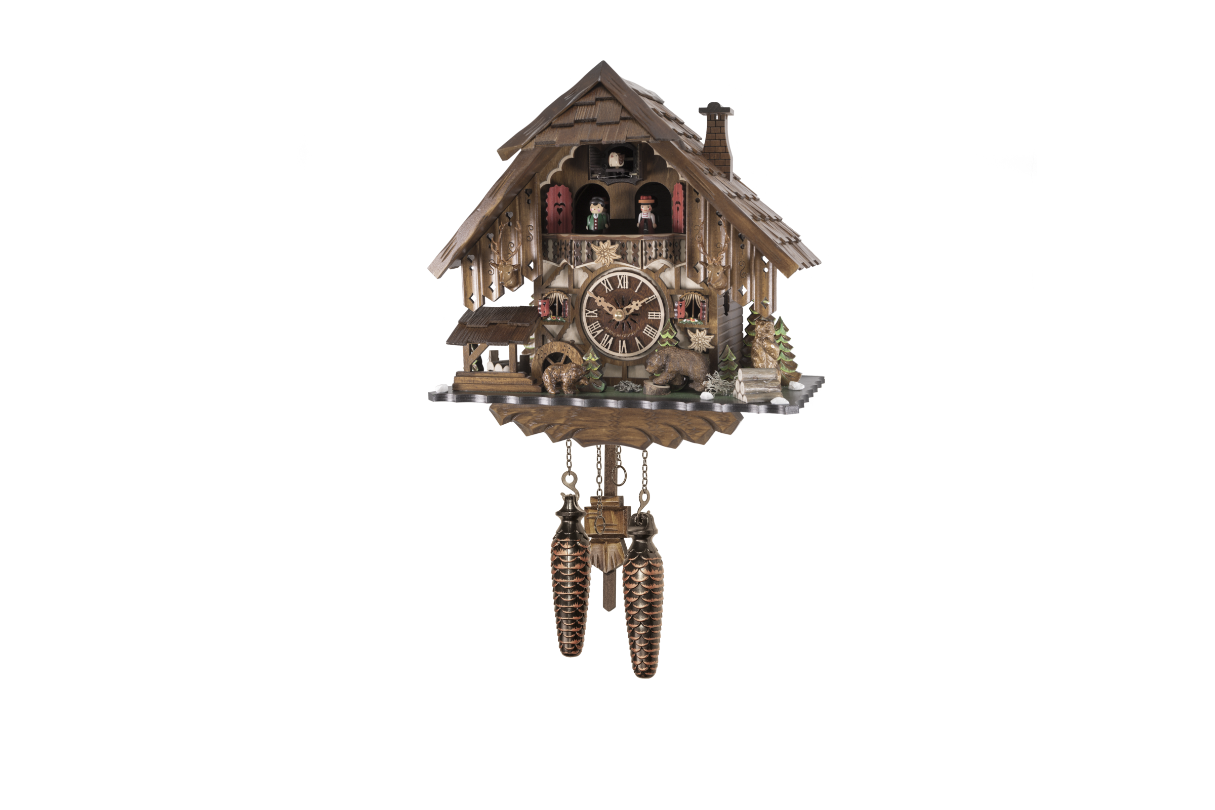 Le chalet et les personnages sont en bois, les décors peints à la main