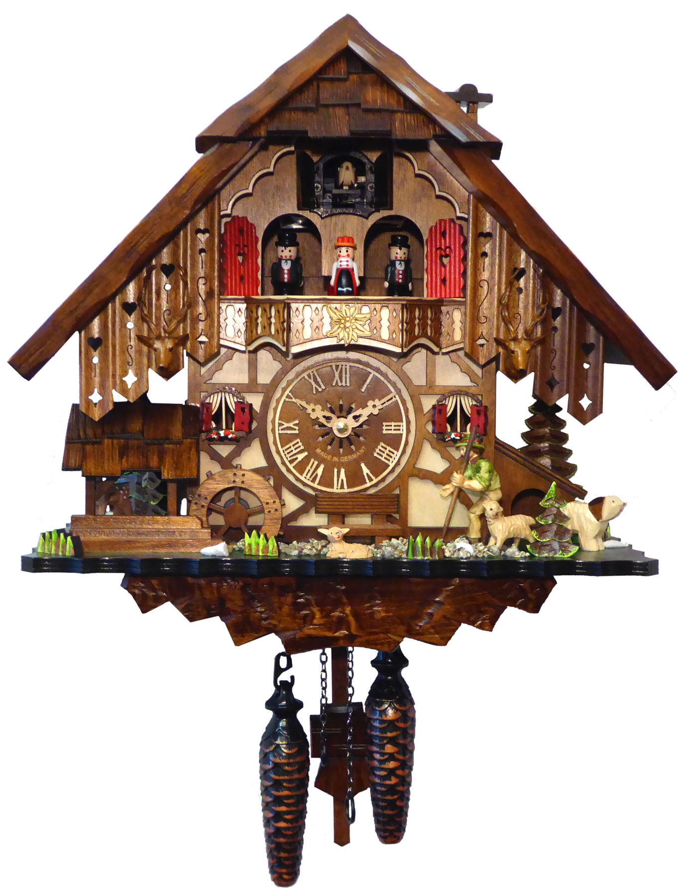 Le chalet et le personnage sont en bois, les décors peints à la main