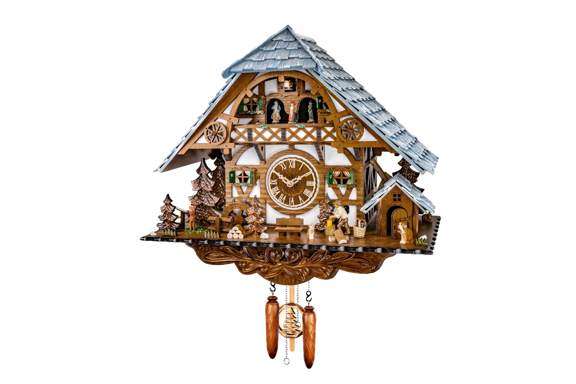 La roue à aube se met  à tourner, le manège de personnages s'anime en musique, et le bûcheron lève sa hâche pour couper le bois