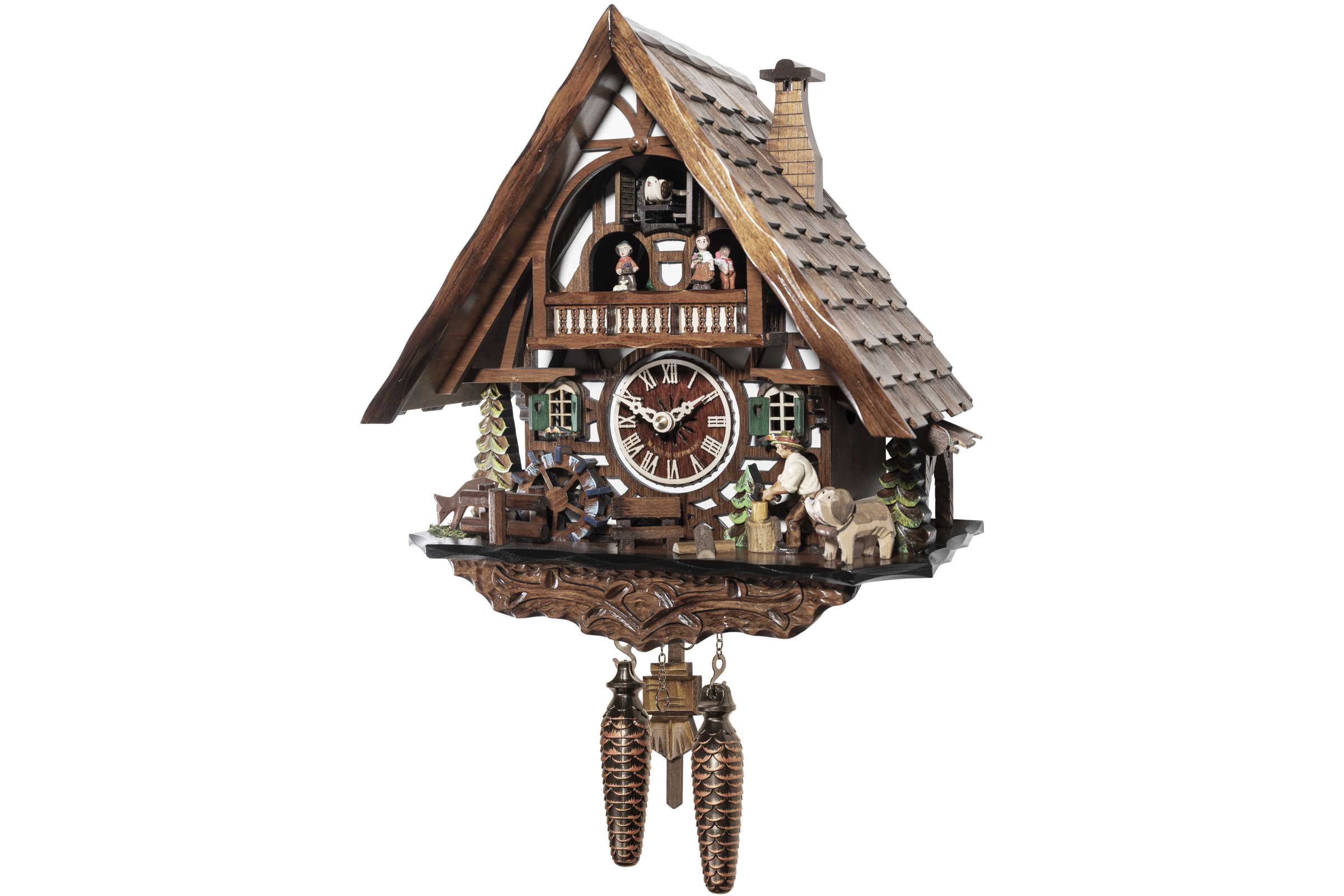 La roue à aube se met  à tourner, le manège de personnages s'anime en musique, et le bûcheron lève sa hâche pour couper le bois