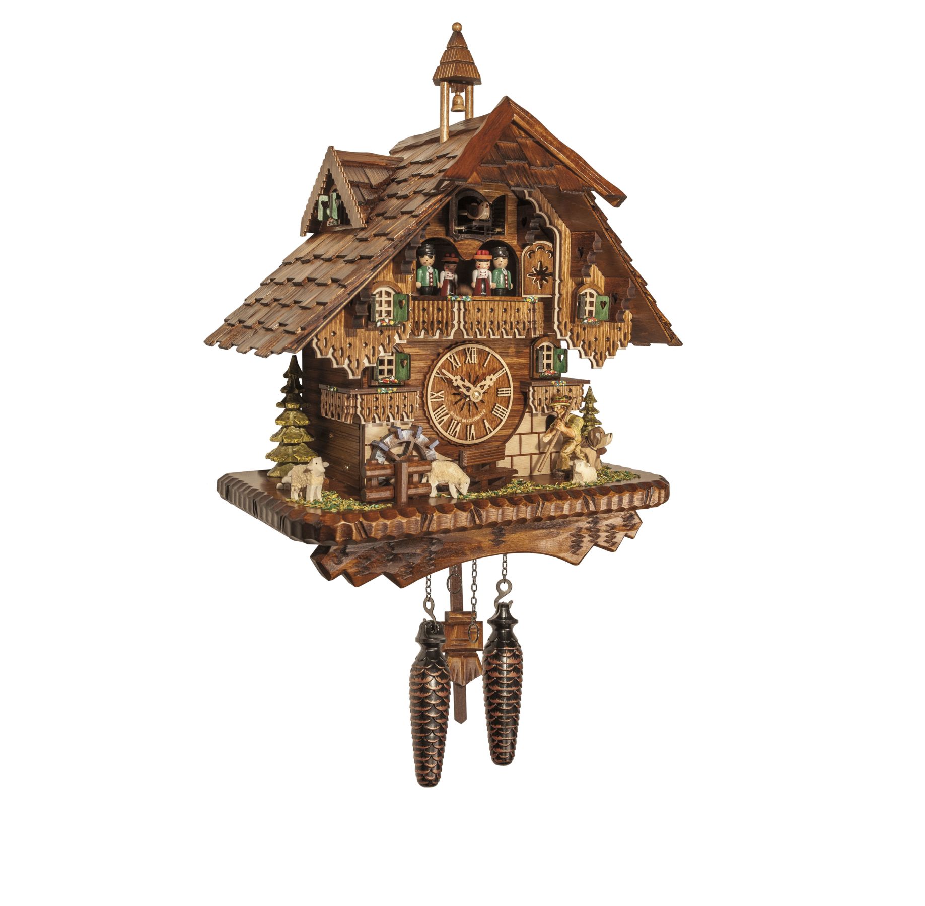 La roue à aube se met  à tourner, le manège de personnages s'anime en musique