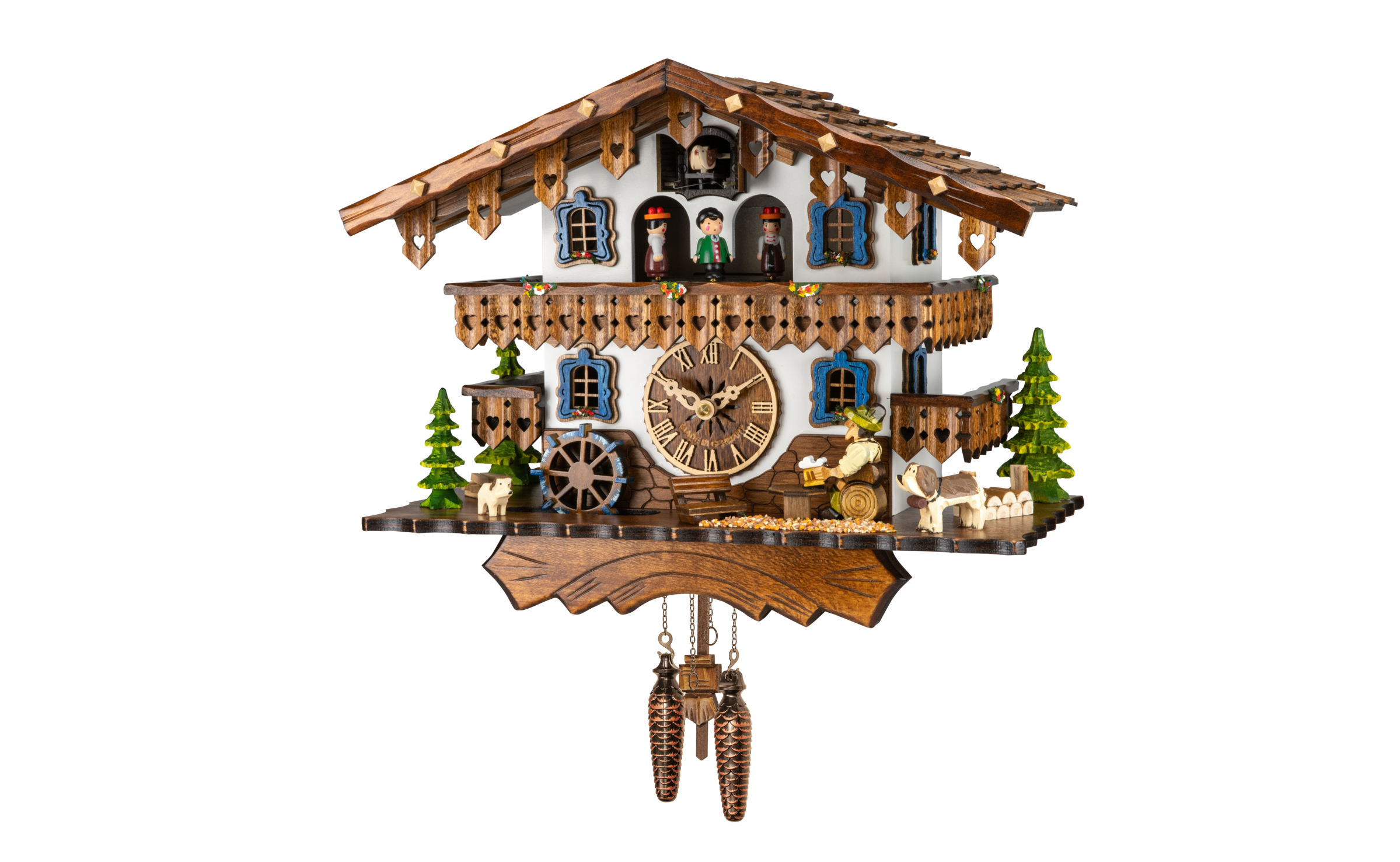 La roue à aube se met  à tourner, le manège de personnages s'anime en musique et le buveur de bière lève sa chope