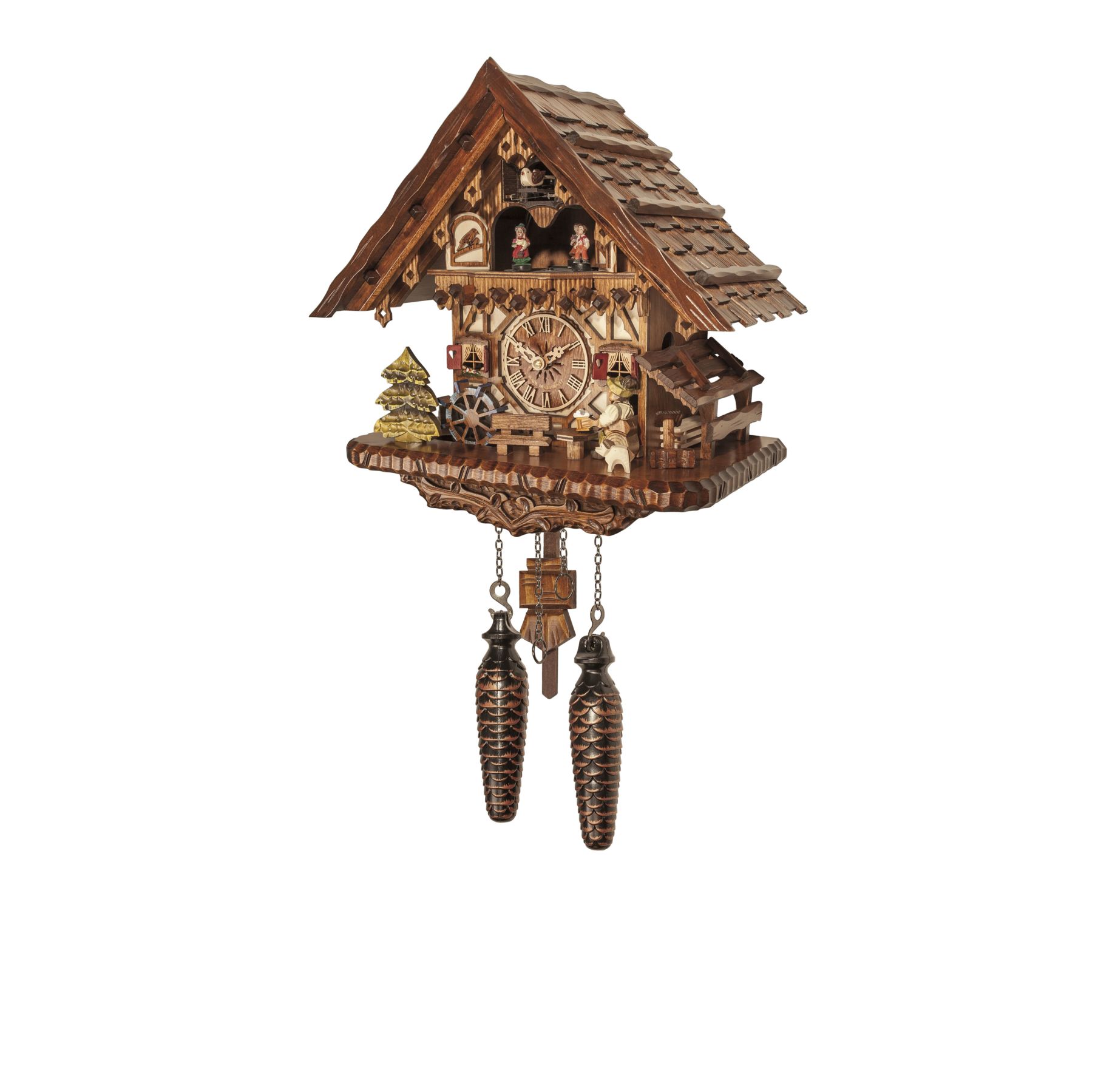 La roue à aube se met  à tourner, le manège de personnages s'anime en musique, et le bûcheron lève sa chope de bière