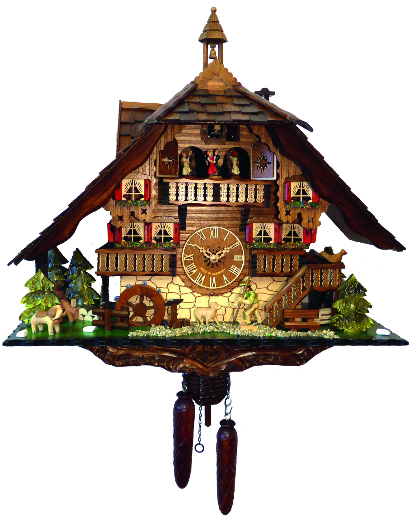 Le chalet et le personnage sont en bois, les décors peints à la main