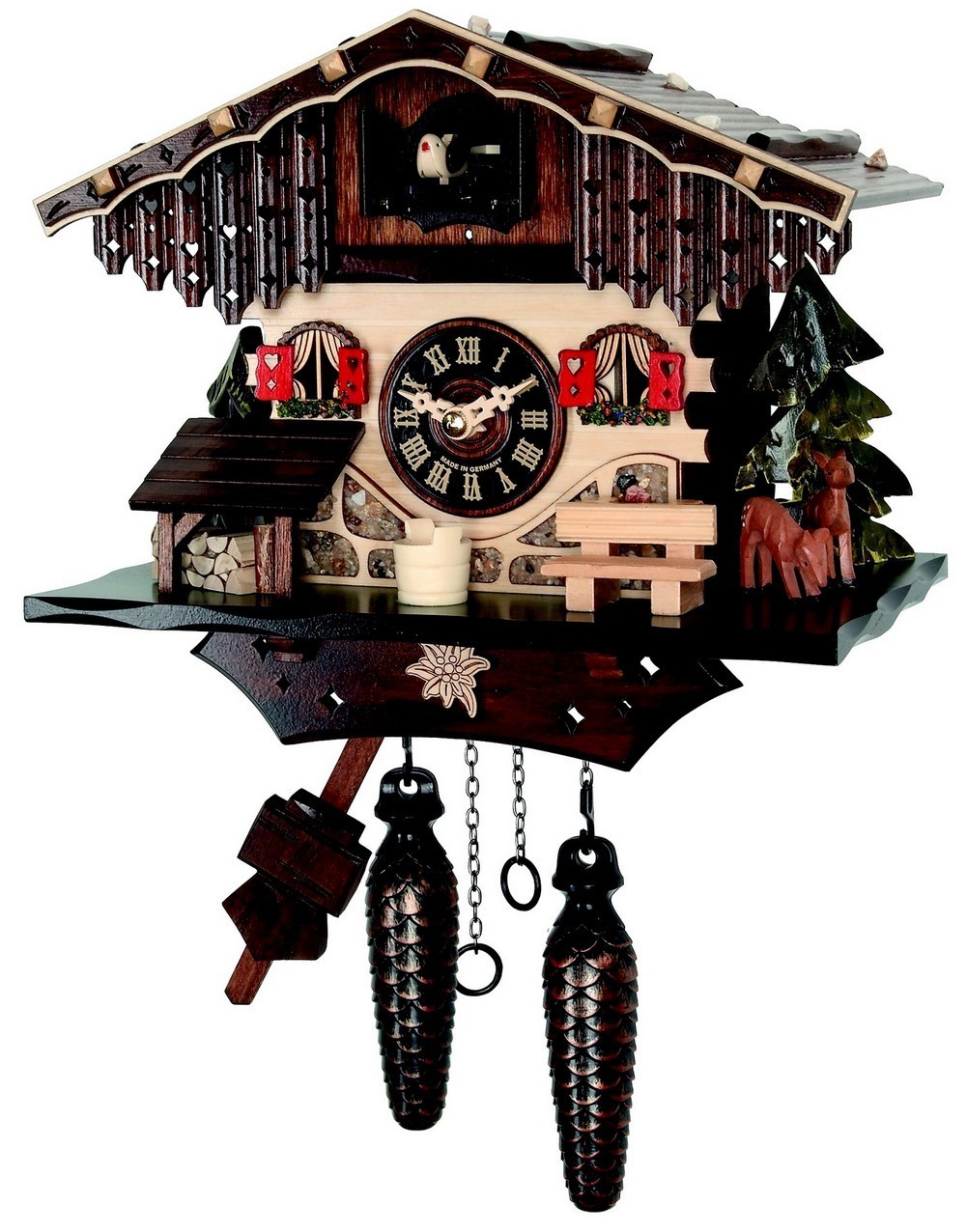 Le chalet et les personnages sont en bois, les décors peints à la main