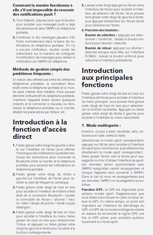 Fonctions : Heures, minutes, dates , Podomètre (calcul du nombre de pas) , Réveil, Barômètre, téléphone,protocole d'entrainement,fréquence cardiaque, oxygène sanguin,stress,cycle sommeil, boussole, météo, musique, appareil photo,chercher le téléphone, calculatrice,calendrier, jeux, Musique , Vidéo