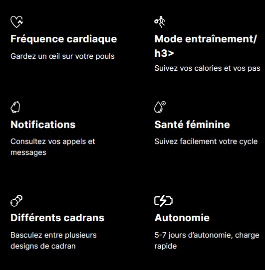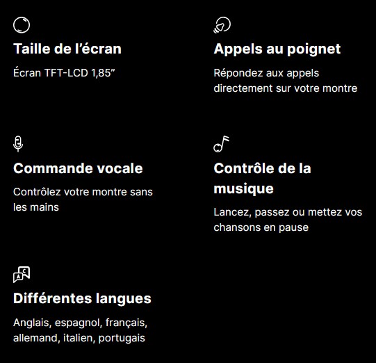 Fonctions : Heures, minutes, dates , Podomètre (calcul du nombre de pas) , Réveil, Barômètre, téléphone,protocole d'entrainement,fréquence cardiaque, oxygène sanguin,stress,cycle sommeil, boussole, météo, musique, appareil photo,chercher le téléphone, calculatrice,calendrier, jeux